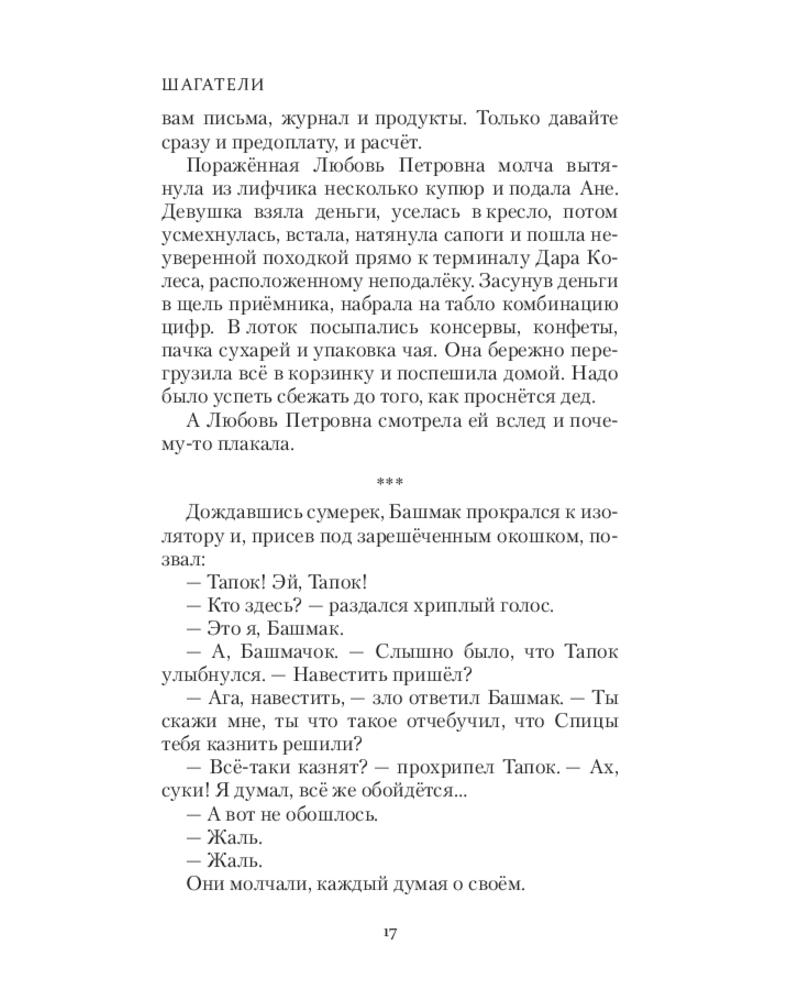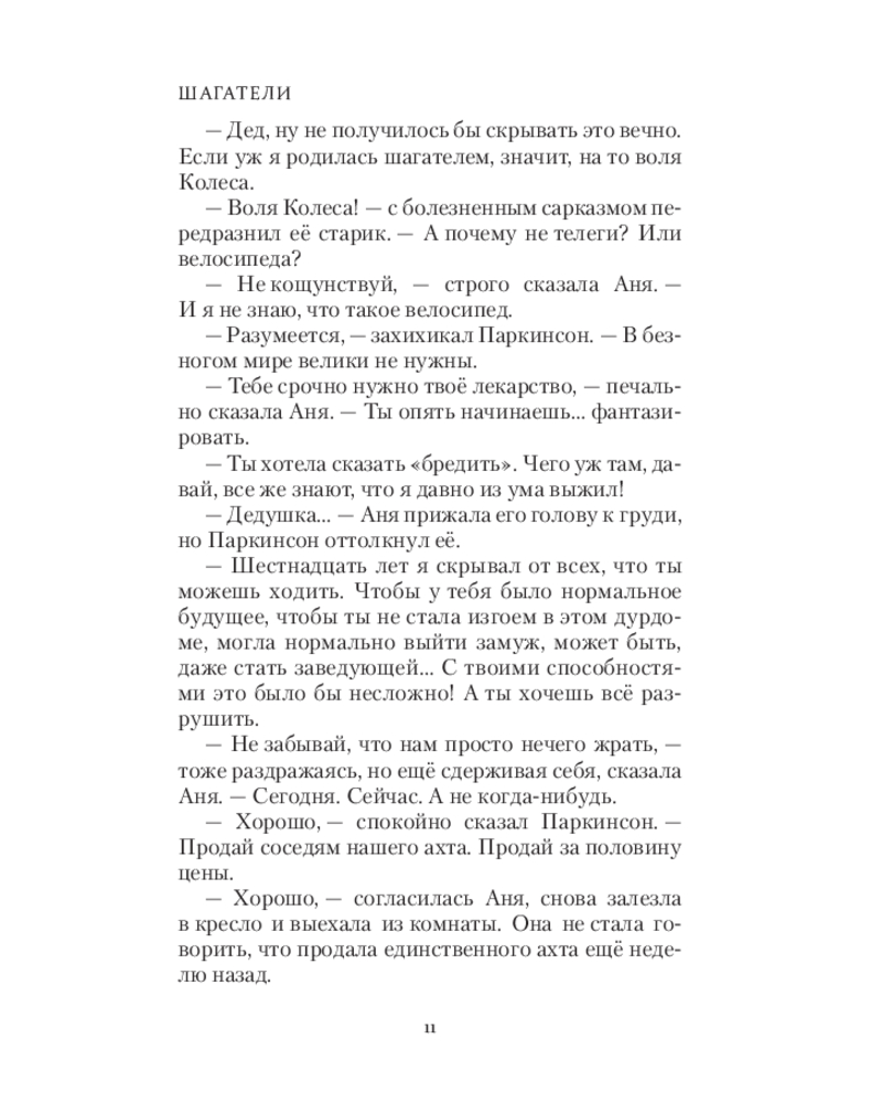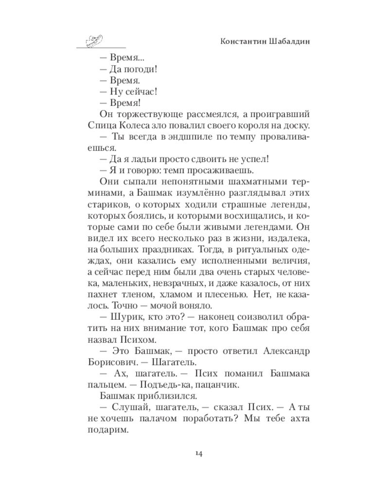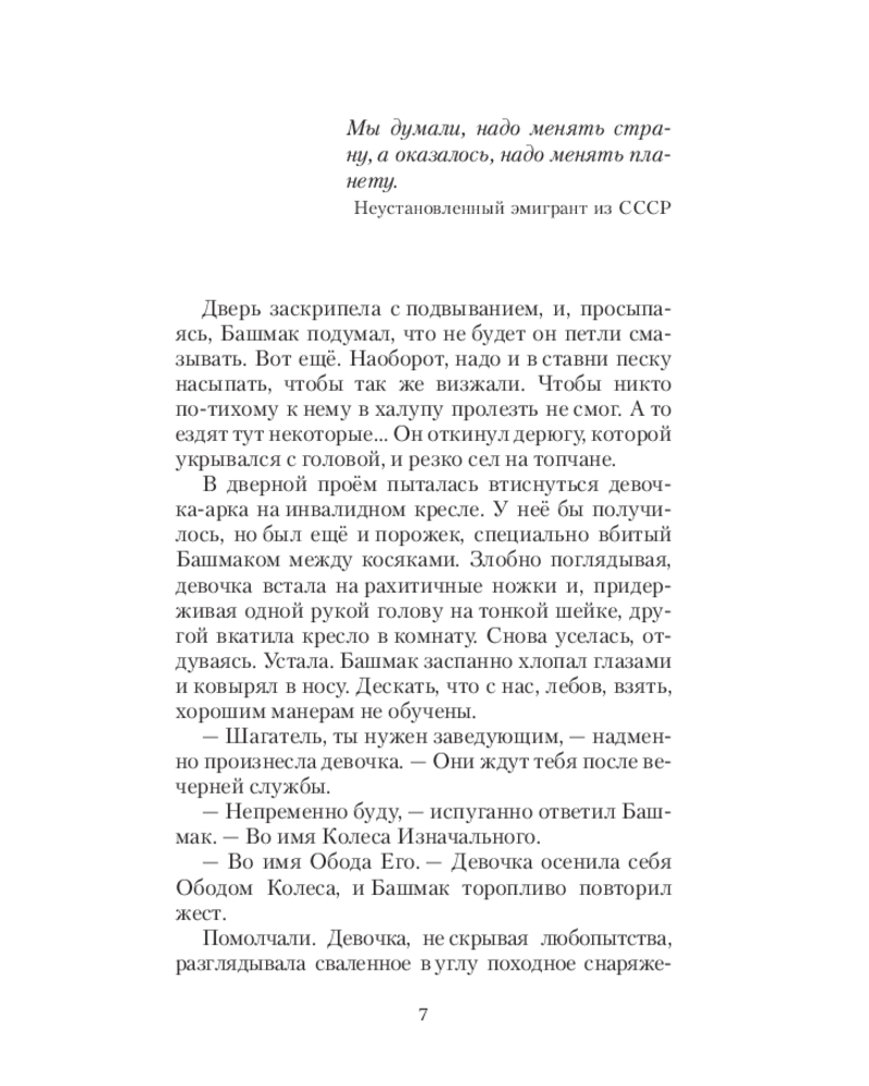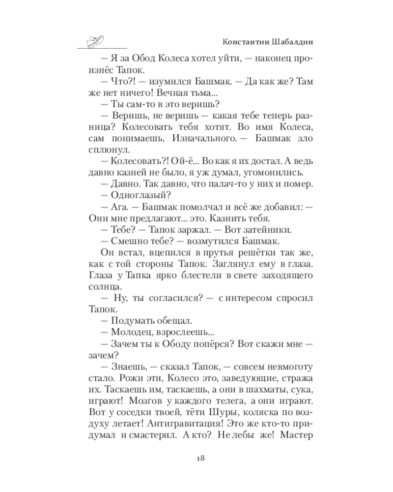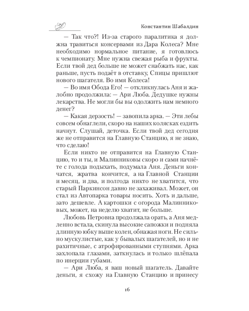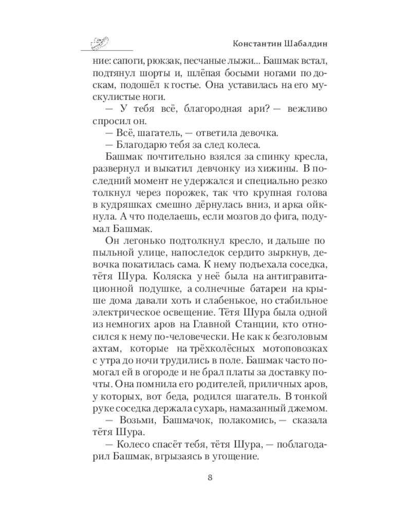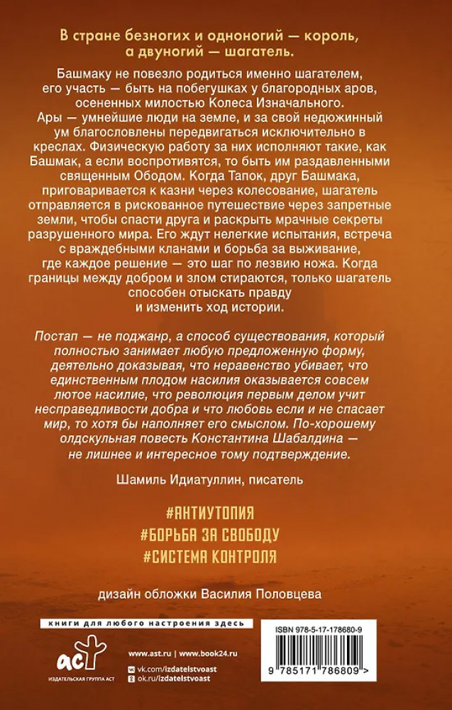 💳 Оплатить за товар можно при получении 🇰🇿 Есть бесплатная доставка по Казахстану от 1 дня 🎁 Копите бонусы с каждой покупки Серия: НоваФикшн. Фантастика: XXI век В стране безногих и одноногий — король, а двуногий — шагатель. Башмаку не повезло родиться именно шагателем, его участь — быть на побегушках у благородных аров, осененных милостью Колеса Изначального. Ары — умнейшие люди на земле, и за свой недюжинный ум благословлены передвигаться исключительно в креслах. Физическую работу за них исполняют такие, как Башмак, а если воспротивятся, то быть им раздавленными священным Ободом. Когда Тапок, друг Башмака, приговаривается к казни через колесование, шагатель отправляется в рискованное путешествие через запретные земли, чтобы спасти друга и раскрыть мрачные секреты разрушенного мира. Его ждут нелегкие испытания, встреча с враждебными кланами и борьба за выживание, где каждое решение — это шаг по лезвию ножа. Когда границы между добром и злом стираются, только шагатель способен отыскать правду и изменить ход истории. |