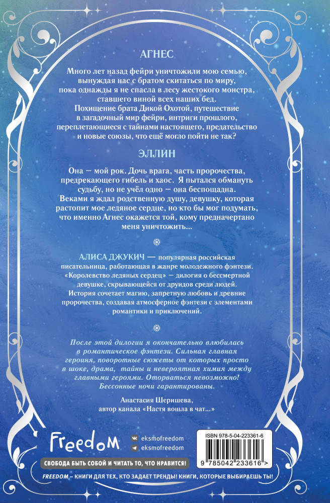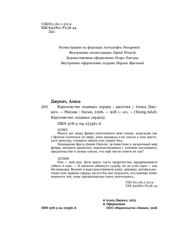 Королевство ледяных сердецВ данный момент этот товар отсутствует в продаже. Возможно, у нас найдется аналогичный или похожий товар здесь. Серия: Young Adult. Королевство ледяных сердец Перед вами коллекционное издание дилогии «Королевство ледяных сердец» Алисы Джукич в одном томе — настоящий подарок для ценителей серии и поклонников «Жестокого принца»! Теперь вся история Агнес Эркенст — бессмертной девушки, разрывающейся между миром людей и тайнами фейри, — собрана под одной обложкой. Совершенно новое оформление — обложка с фольгой и вырубкой! Внутри пять сюжетных вклеек на мелованной бумаге, бонусные эпизоды, атмосферная верстка, а также красочные форзацы с заснеженным замком и картой мира. Запечатанный узором обрез — это издание гарантированно станет украшением вашей полки! В подарок к каждому экземпляру — изящная акриловая закладка с хрупкой ледяной розой! |