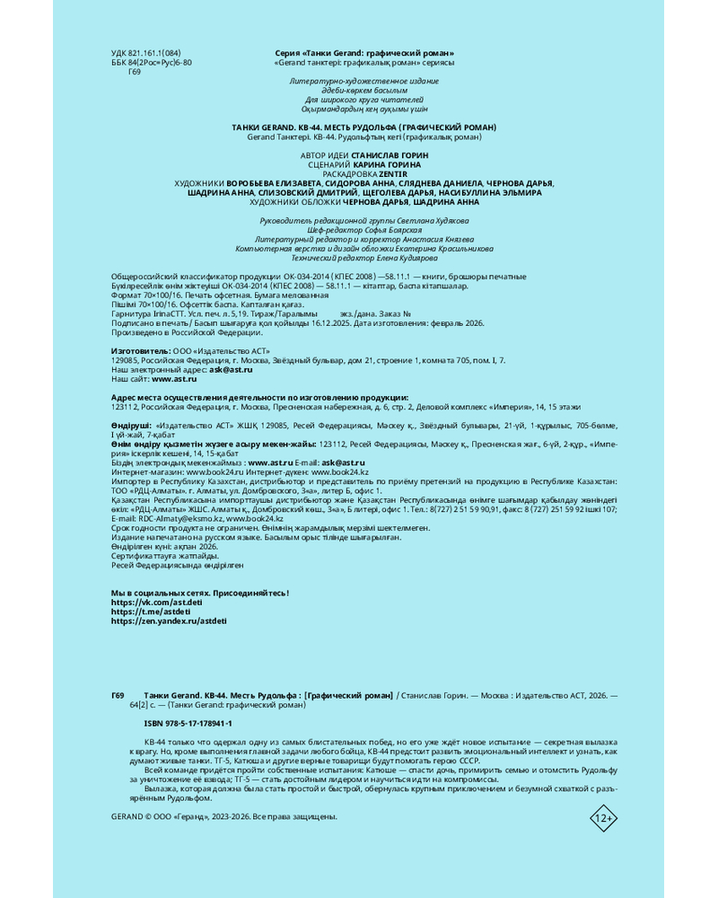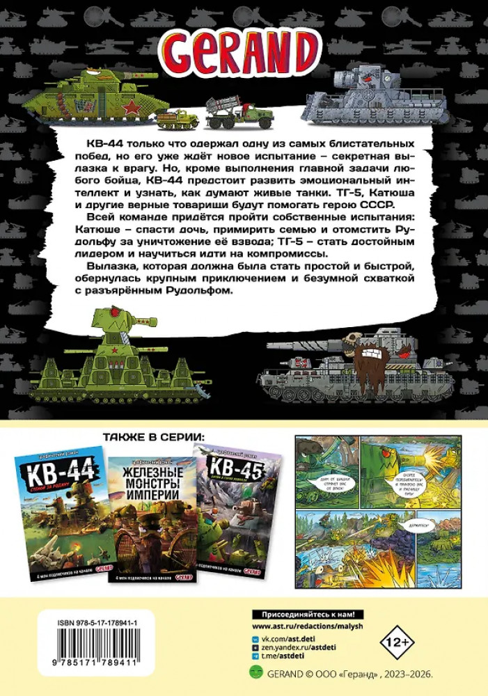 💳 Оплатить за товар можно при получении 🇰🇿 Есть бесплатная доставка по Казахстану от 1 дня 🎁 Копите бонусы с каждой покупки Серия: Танки Gerand: графический роман КВ-44 только что одержал одну из самых блистательных побед, но его уже ждёт новое испытание — секретная вылазка к врагу. Но, кроме выполнения главной задачи любого бойца, КВ-44 предстоит развить эмоциональный интеллект и узнать, как думают живые танки. ТГ-5, Катюша и другие верные товарищи будут помогать герою СССР. |