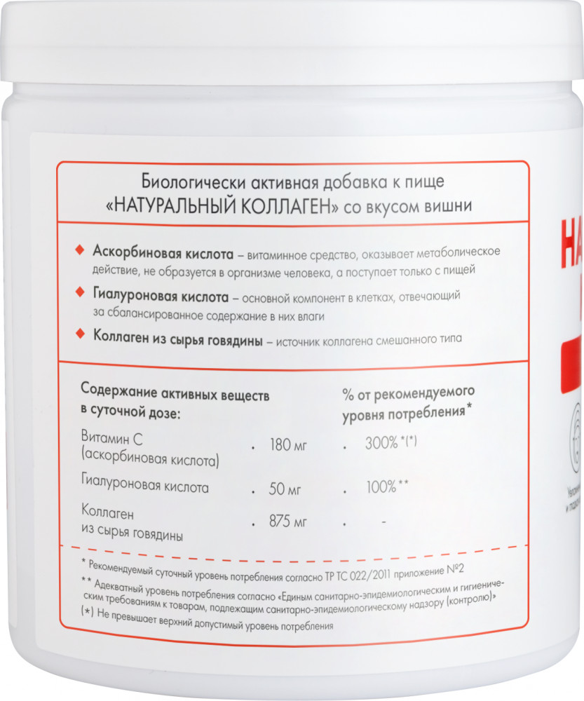 Очищенная вода, основа желирующая из коллагенсодержащего сырья говядины, аскорбиновая кислота, гиалуроновая кислота, консерванты: высококачественный дистиллированный уксус, сорбат калия, пищевой ароматизатор. Содержание активных веществ в суточной дозе: Витамин C (аскорбиновая кислота) 180 мг, гиалуроновая кислота 50 мг, коллаген из сырья говядины 875 мг.