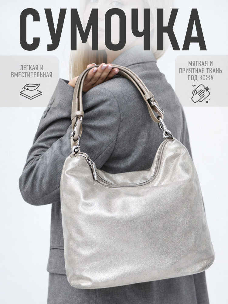 Сумка выполнена из мягкой экокожи с приятной текстурой и легким металлическим блеском. Материал выглядит эффектно и при этом устойчив к износу. Благодаря мягкой конструкции сумка комфортно лежит на плече и не утяжеляет образ. Сумка вместительная — легко помещаются кошелек, телефон, косметичка, документы формата A5 и другие повседневные вещи.