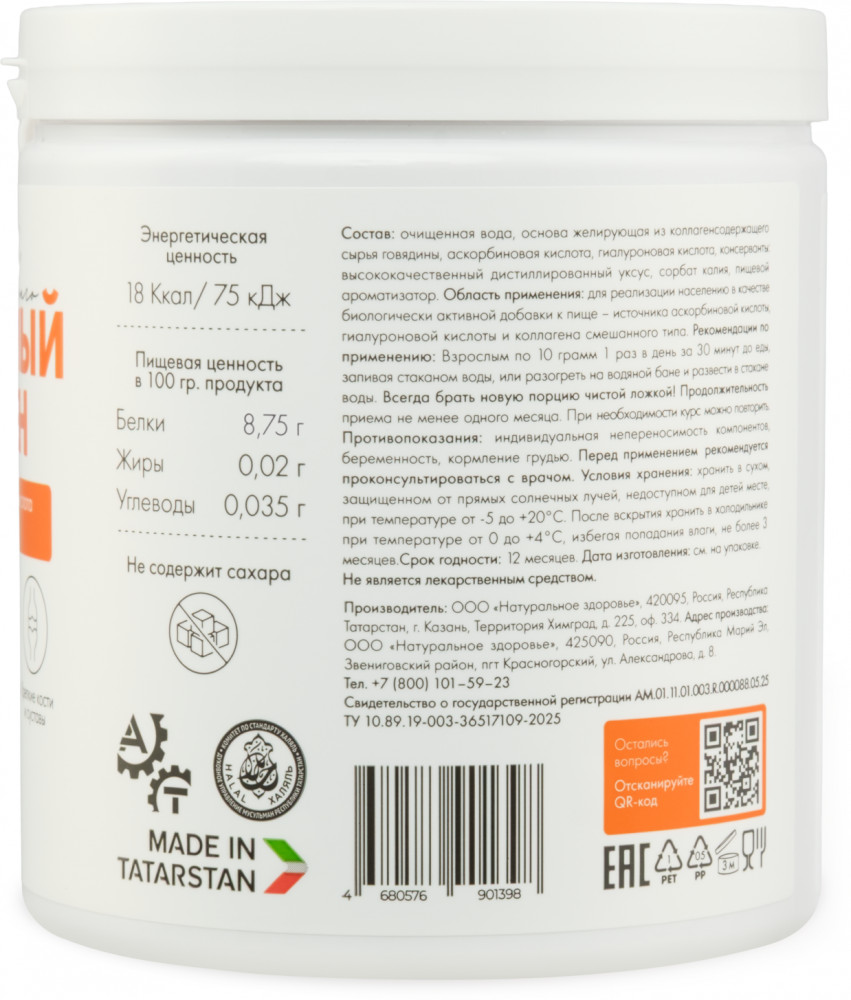 Коллаген для суставов, волос и кожи, желеобразный, живой коллаген 1 2 3 типа, комплекс 19 аминокислот, 380 грамм, Natural Health - это уникальный продукт, который защитит ваше здоровье и поможет достичь желаемого результата. Коллаген порошок имеет формулу 1, которая обеспечивает его высокую эффективность и быстрое воздействие на суставы, волосы и кожу. Живой коллаген, содержащийся в нем, позволяет работать в синергии с вашим организмом, в результате чего происходит нормализация работы суставов и улучшение состояния кожи и волос. Коллаген пищевой, содержащийся в этом продукте, является источником полезных веществ, таких как калий, кальций, магний, натрий, железо, марганец, медь, селен, цинк, а также различные жирные кислоты, витамин С и аминокислоты.