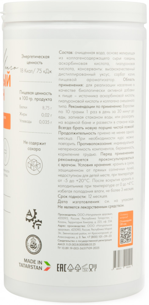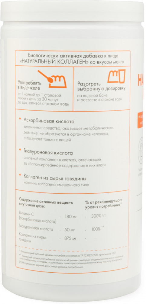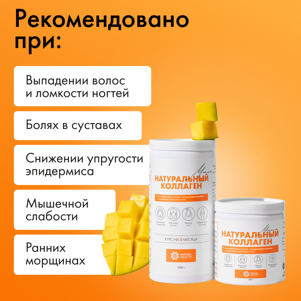Коллаген для суставов, волос и кожи, желеобразный, живой коллаген 1 2 3 типа, комплекс 19 аминокислот, 380 грамм, Natural Health - это уникальный продукт, который защитит ваше здоровье и поможет достичь желаемого результата. Коллаген порошок имеет формулу 1, которая обеспечивает его высокую эффективность и быстрое воздействие на суставы, волосы и кожу. Живой коллаген, содержащийся в нем, позволяет работать в синергии с вашим организмом, в результате чего происходит нормализация работы суставов и улучшение состояния кожи и волос. Коллаген пищевой, содержащийся в этом продукте, является источником полезных веществ, таких как калий, кальций, магний, натрий, железо, марганец, медь, селен, цинк, а также различные жирные кислоты, витамин С и аминокислоты. Комбинация коллаген говяжий обеспечивает комплексное питание организма и помогает укрепить иммунную систему. Коллаген капсулы желе также подходит для людей, придерживающихся халяльного образа жизни. Специально разработанная формула, которая учитывает эти требования, делает его пригодным для употребления всеми желающими. Витамины для женщин, для кожи, входящий в состав этой комплексной пищевой добавки, поможет вам сохранить молодость и красоту кожи. Он содержит аминокислоты, необходимые для ее здоровья, а также комплекс витаминов, который поддерживает оптимальное состояние кожи. Colagen для связок и суставов является неотъемлемой частью спортивного питания и поможет вам достичь ваших спортивных целей. Коллаген морской разработан с использованием передовых технологий и содержит биодоступные формы коллагена и аминокислот, которые улучшают связки и суставы, а также снижают риск возникновения травм. Коллаген со вкусом манго также можно использовать в рамках программы похудения. Его уникальная формула поможет вам снизить аппетит и ускорить обмен веществ. Колаген порошок с витамином с и гиалуроновой кислотой является отличным дополнением к вашей диете и поможет вам достичь желаемого результата. Витамины для женщин, мужчин и детей, содержащиеся в этом препарате, обеспечат ваш организм всем необходимым для правильного функционирования. Кроме того, этот продукт содержит аминокислоты, которые являются основными строительными блоками организма и необходимы для его нормального функционирования. Разнообразие полезных веществ, которые присутствуют в этом спортивном комплексе, делает его идеальным выбором для активных людей, которые заботятся о своем здоровье и хотят достичь наилучших результатов. Он является незаменимым спутником во время тренировок и поможет вам достичь ваших целей в спорте и отдыхе.С этим бадом ваша дорога к успеху и желаемому результату будет намного легче. Он обеспечит ваш организм всеми необходимыми веществами и поможет достичь прекрасной формы.