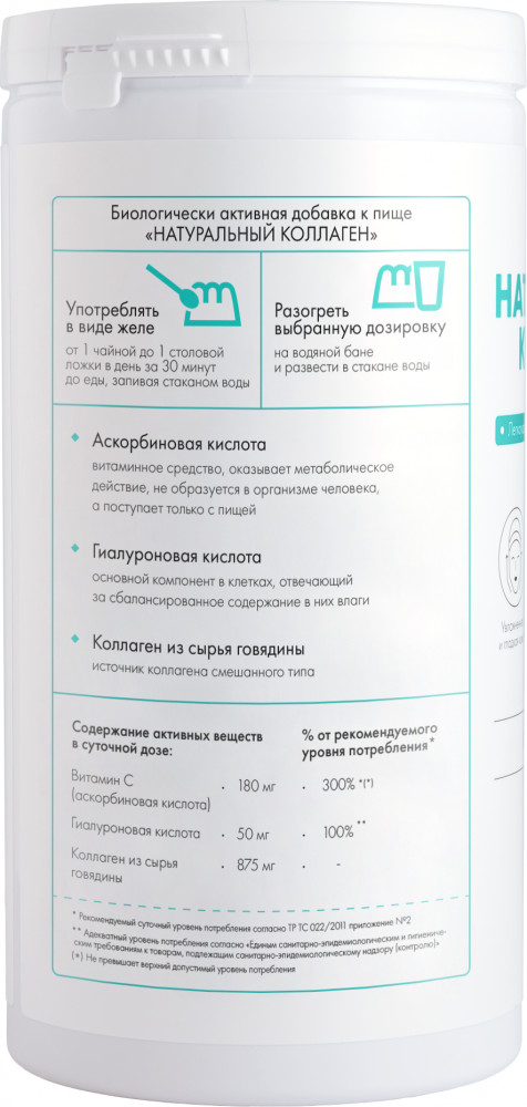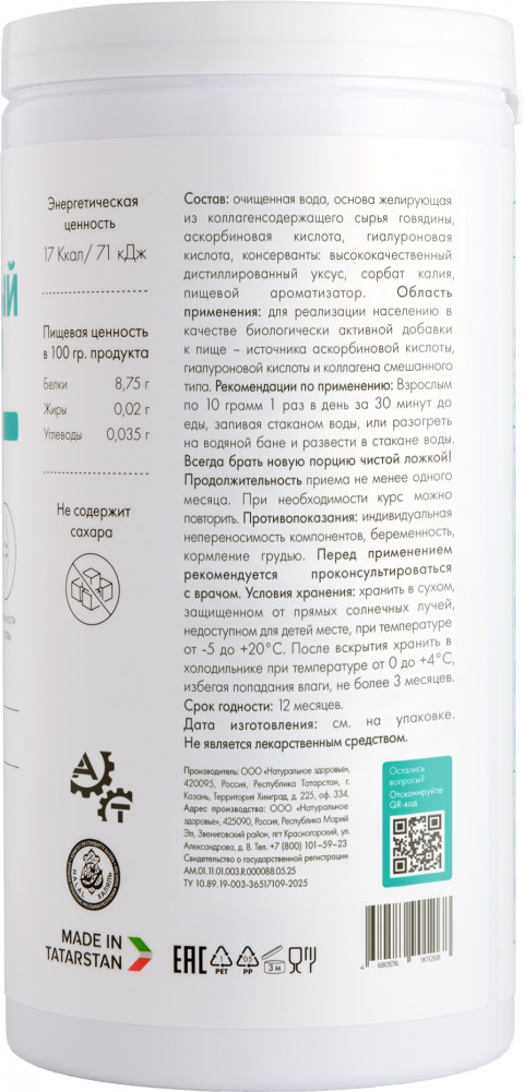 Очищенная вода, основа желирующая из коллагенсодержащего сырья говядины, аскорбиновая кислота, гиалуроновая кислота, консерванты: высококачественный дистиллированный уксус, сорбат калия, пищевой ароматизатор. Содержание активных веществ в суточной дозе: Витамин C (аскорбиновая кислота) 180 мг, гиалуроновая кислота 50 мг, коллаген из сырья говядины 875 мг.