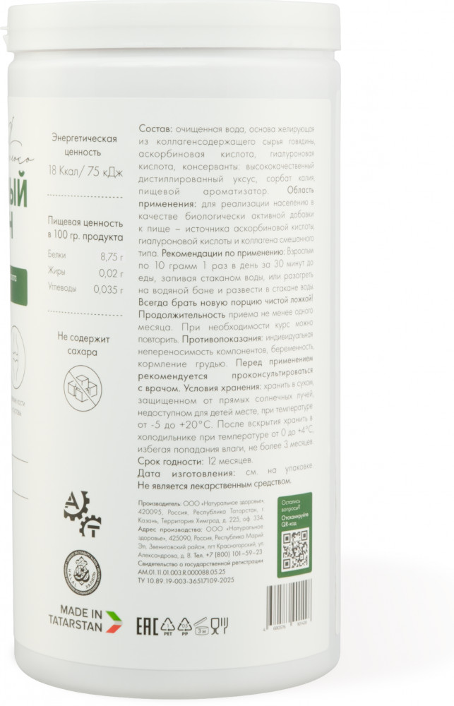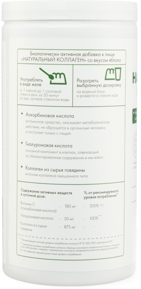Очищенная вода, основа желирующая из коллагенсодержащего сырья говядины, аскорбиновая кислота, гиалуроновая кислота, консерванты: высококачественный дистиллированный уксус, сорбат калия, пищевой ароматизатор. Содержание активных веществ в суточной дозе: Витамин C (аскорбиновая кислота) 180 мг, гиалуроновая кислота 50 мг, коллаген из сырья говядины 875 мг.