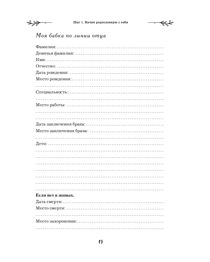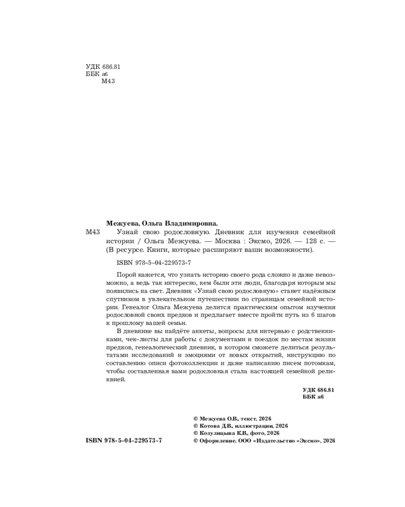 💳 Оплатить за товар можно при получении 🇰🇿 Есть бесплатная доставка по Казахстану от 1 дня 🎁 Копите бонусы с каждой покупки Серия: В ресурсе. Книги, которые расширяют ваши возможности Порой кажется, что узнать историю своего рода сложно и даже невозможно, а ведь так интересно, кем были эти люди, благодаря которым мы появились на свет... Историк и генеалог Ольга Межуева предлагает понятные рекомендации, благодаря которым каждый сможет уверенно начать собирать своё уникальное генеалогическое дерево — начиная с работы с историческими архивами и заканчивая поездками по местам жизни предков. Этот дневник поможет пробудить внутреннего искателя приключений, на каждом этапе поддерживая исследователя на его пути к истории своей семьи. |