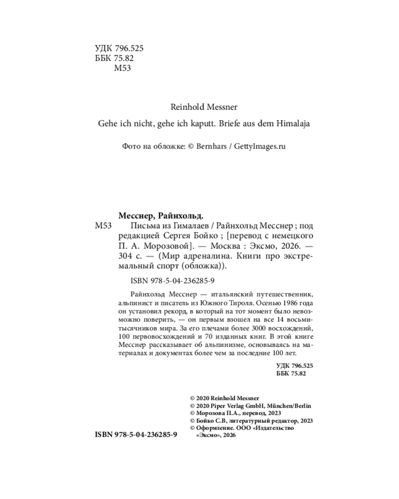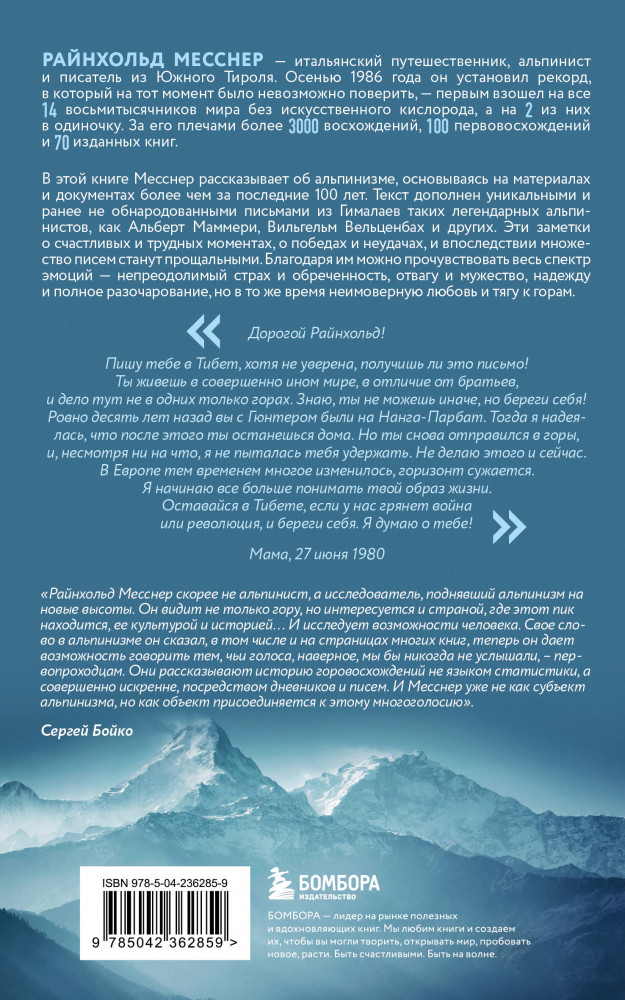 💳 Оплатить за товар можно при получении 🇰🇿 Есть бесплатная доставка по Казахстану от 1 дня 🎁 Копите бонусы с каждой покупки Серия: Мир адреналина. Книги про экстремальный спорт (обложка) Райнхольд Месснер — живая легенда альпинизма, путешественник, писатель и человек, навсегда изменивший представление о возможностях человека в горах. Осенью 1986 года он совершил то, что считалось невозможным: первым в истории поднялся на все 14 восьмитысячников мира без искусственного кислорода, а два из них прошел в одиночку. За его плечами — более 3000 восхождений, 100 первовосхождений и 70 книг, переведенных на десятки языков. |