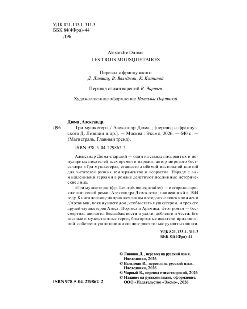 💳 Оплатить за товар можно при получении 🇰🇿 Есть бесплатная доставка по Казахстану от 1 дня 🎁 Копите бонусы с каждой покупки Серия: Магистраль. Главный тренд «Три мушкетёра» (фр. Les trois mousquetaires) — историко-приключенческий роман Александра Дюма-отца, написанный в 1844 году. Книга посвящена приключениям молодого человека по имени д’Артаньян, покинувшего дом, чтобы стать мушкетёром, и трёх его друзей-мушкетёров: Атоса, Портоса и Арамиса. Этот роман — бессмертная апология бесшабашности и удали, доблести и чести. Его весёлые и мужественные герои, благородные искатели приключений, собственную линию жизни поверяют только рукоятью шпаги. |
