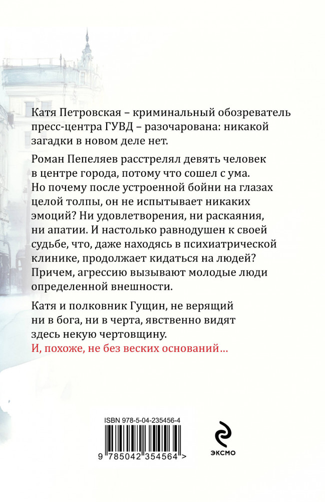 💳 Оплатить за товар можно при получении 🇰🇿 Есть бесплатная доставка по Казахстану от 1 дня 🎁 Копите бонусы с каждой покупки Серия: Столичный детектив. Новое оформление (обложка) Катя Петровская — криминальный обозреватель пресс-центра ГУВД — разочарована: никакой загадки в новом деле нет. Роман Пепеляев расстрелял девять человек в центре города, потому что сошел с ума. Но почему после устроенной бойни на глазах целой толпы он не испытывает никаких эмоций? Ни удовлетворения, ни раскаяния, ни апатии. И настолько равнодушен к своей судьбе, что, даже находясь в психиатрической клинике, продолжает кидаться на людей? Причем агрессию вызывают молодые люди определенной внешности. Катя и полковник Гущин, не верящий ни в бога, ни в черта, явственно видят здесь некую чертовщину. И, похоже, не без веских оснований... |