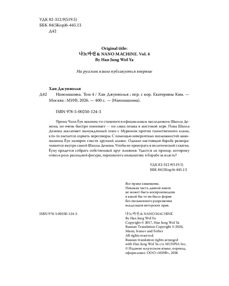 💳 Оплатить за товар можно при получении 🇰🇿 Есть бесплатная доставка по Казахстану от 1 дня 🎁 Копите бонусы с каждой покупки Серия: Наномашины Чхон Ёун, наконец признанный истинным наследником Школы Демона, быстро понимает, что высокий титул — лишь иллюзия власти. Пока Патриарх заключает вынужденный и хрупкий союз с извечным врагом — силами Мурима — против таинственного и беспощадного клана Шести Искусств Бога Клинков, внутри самой Школы зреет новый заговор. |