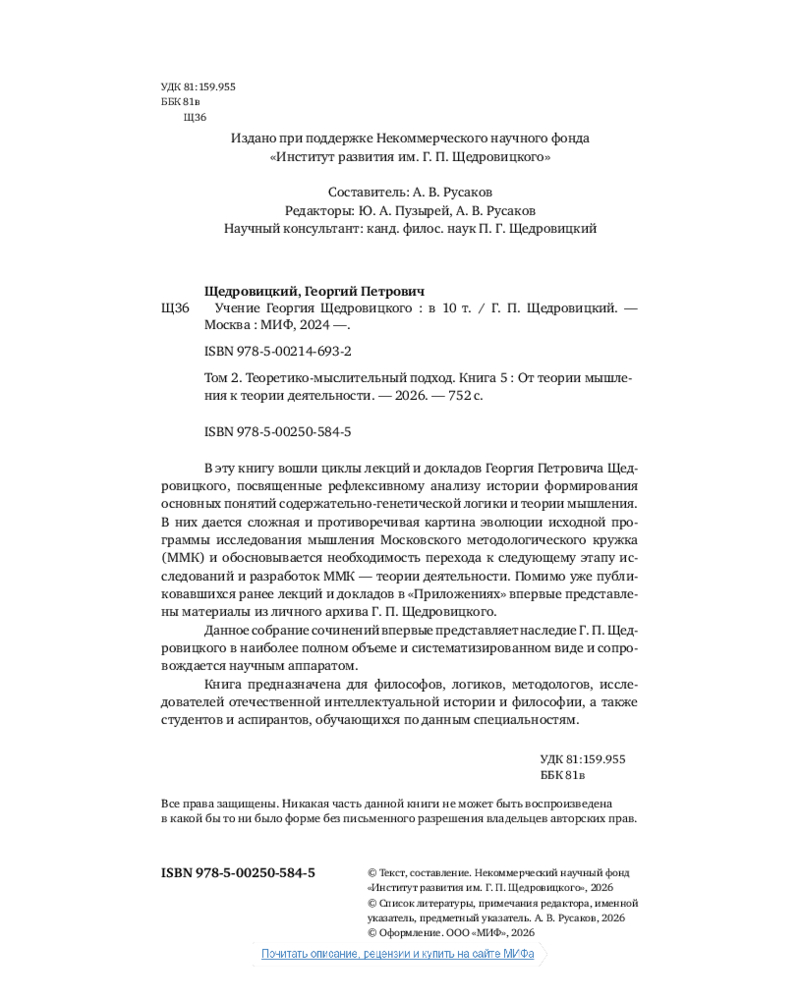 💳 Оплатить за товар можно при получении 🇰🇿 Есть бесплатная доставка по Казахстану от 1 дня 🎁 Копите бонусы с каждой покупки Серия: Учение Г. П. Щедровицкого Пятая книга второго тома серии, посвященной работам философа и методолога Георгия Петровича Щедровицкого. |