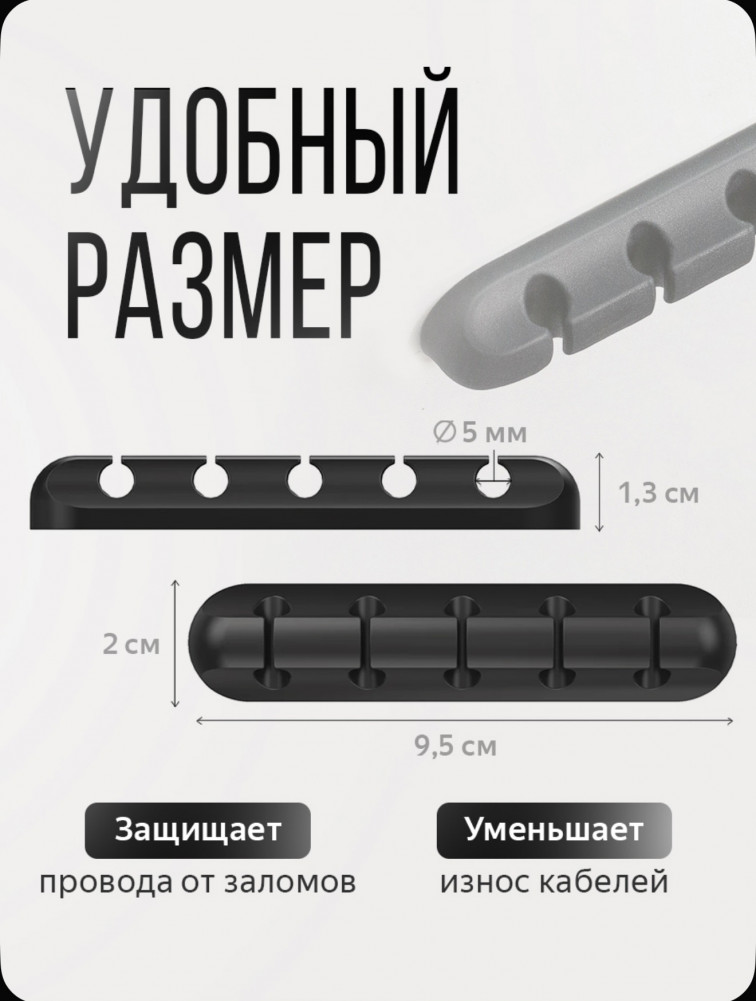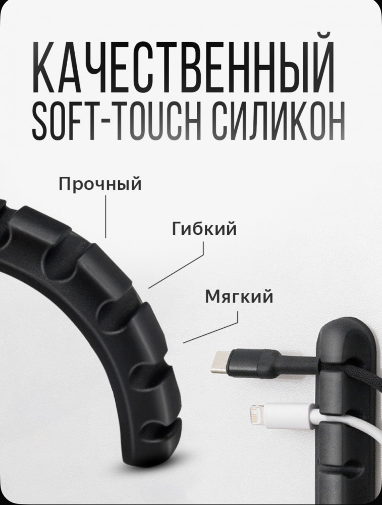 Представляем вам органайзер для проводов, зарядок и кабелей в белом исполнении с 5 отверстиями. Изготовленный из мягкого, но прочного soft-touch силикона, он обеспечивает надежную защиту ваших проводов от износа и заломов. Гибкая конструкция держателя позволяет закрепить его даже на выпуклых поверхностях, а пять отверстий обеспечивают идеальную организацию.
