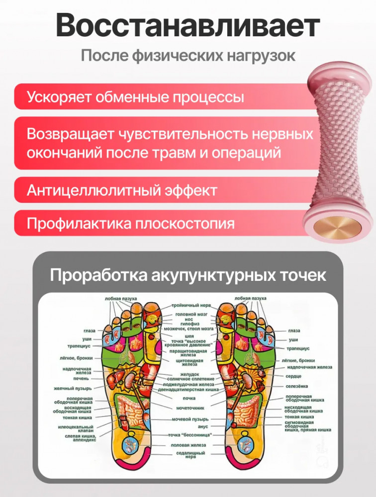 💳 Оплатить за товар можно при получении 🇰🇿 Есть бесплатная доставка по Казахстану от 1 дня 🎁 Копите бонусы с каждой покупки Подарите своим ногам легкость и здоровье! Универсальный массажный валик — это ваш персональный терапевт у вас дома. Благодаря уникальному рельефному дизайну с игольчатой поверхностью, он обеспечивает глубокую проработку тканей, помогая снять усталость и мышечное напряжение после долгого дня или интенсивной тренировки. |