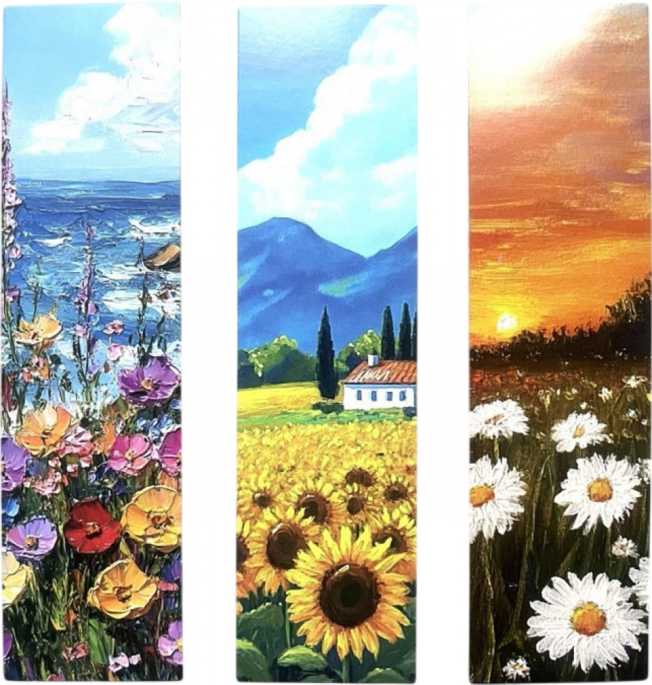 Атмосферные закладки для книг с живописными пейзажами — маленькие произведения искусства, которые будут сопровождать вас между страницами любимых историй. Морские закаты, цветущие поля, уютные улочки, маяки и парусники создают ощущение путешествия, вдохновения и мечты. Насыщенные цвета и художественный стиль делают каждую закладку выразительной и эстетичной. Это настроение — спокойствие моря, тепло заката и лёгкость летнего дня. Закладки выполнены из картона, лёгкие, удобные и долговечные в использовании. Размер: 4×16 см (небольшой размер). Идеальный вариант для книголюбов, творческих людей и тех, кто ценит красивые детали.