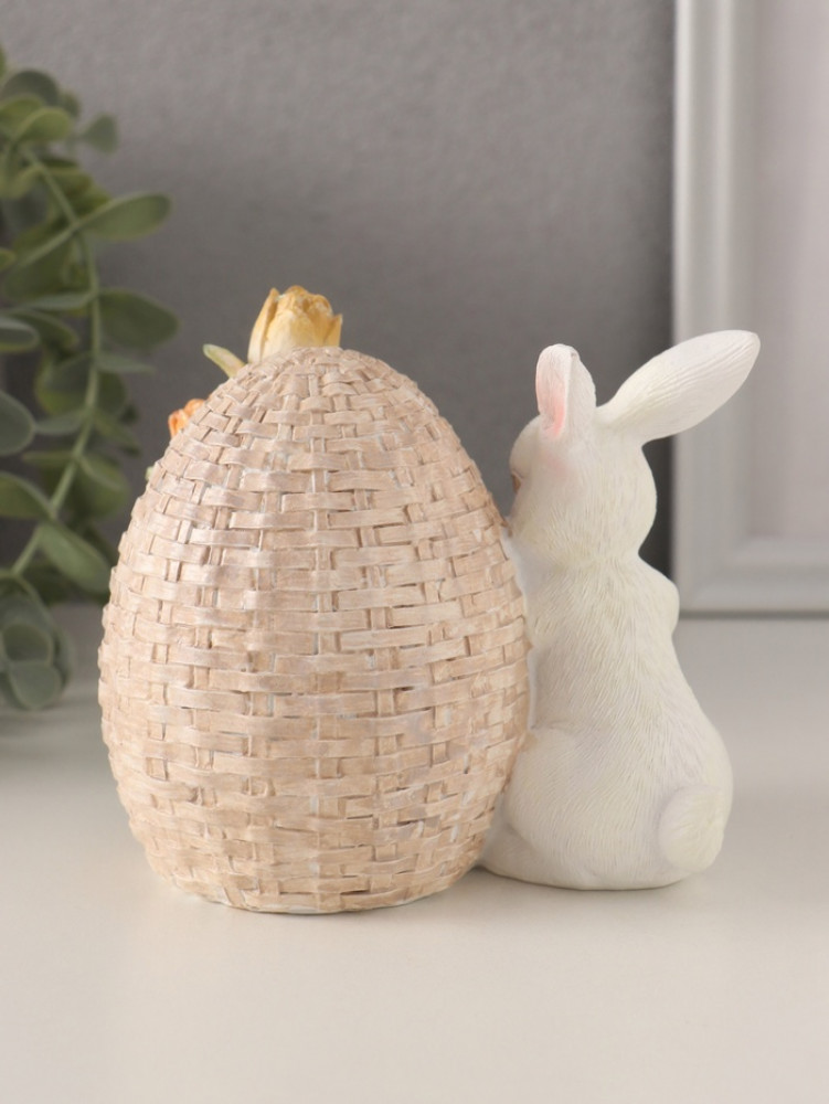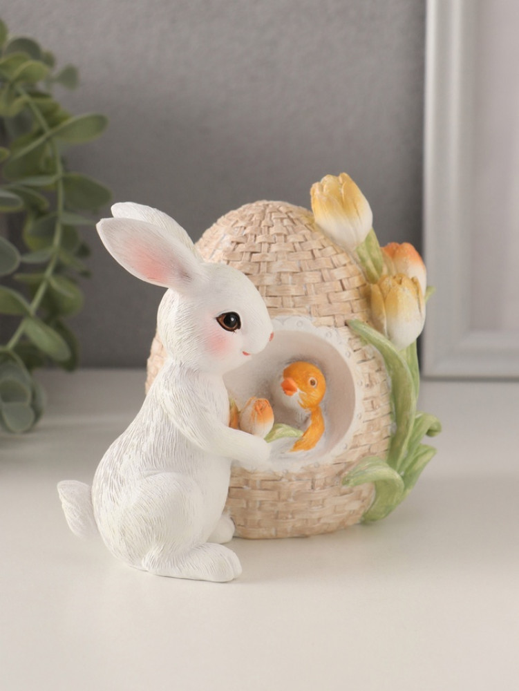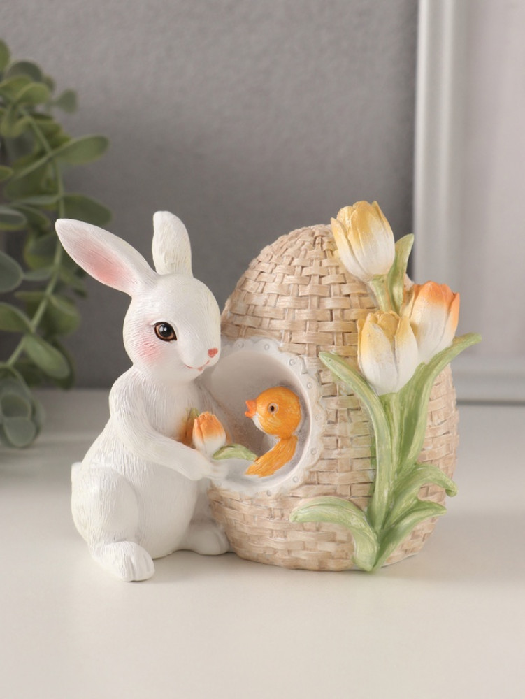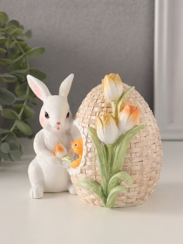 Фигурка «Кролик с цыплёнком в плетённом яйце с тюльпанами»-40% +67