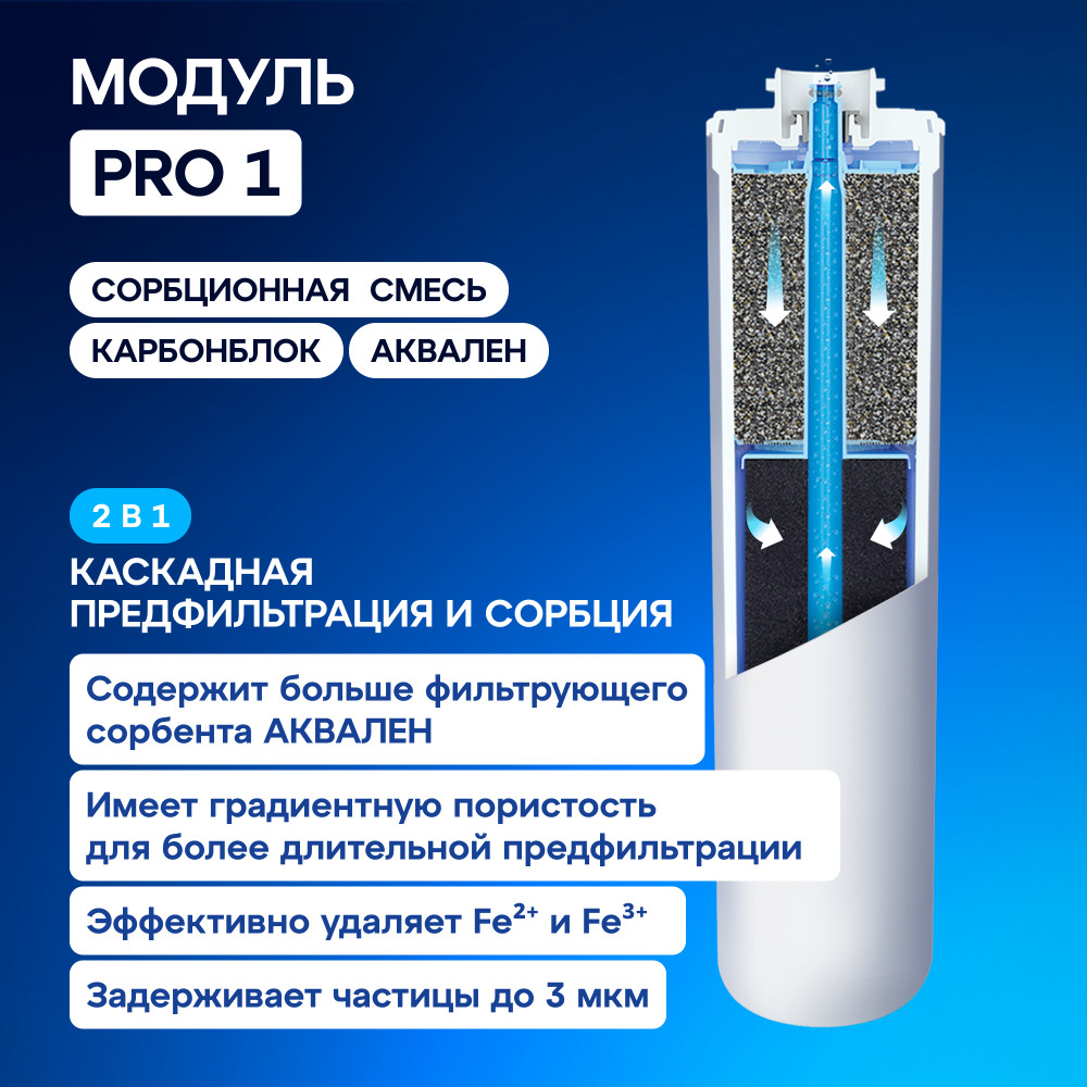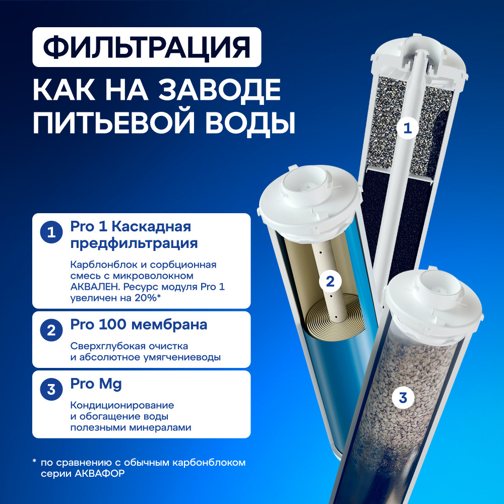 💳 Оплатить за товар можно при получении 🇰🇿 Есть бесплатная доставка по Казахстану от 1 дня 🎁 Копите бонусы с каждой покупки Обратноосмотическая система повышенной производительности с инновационным модулем предочистки 2 в 1 и компактным коллектором, оснащенным дополнительным уровнем безопасности. Модуль повышенной грязеёмости Pro 1 заменяет два модуля предочистки, которые используются в предыдущем поколении фильтров АКВАФОР серии Осмо. Предварительная и глубокая фильтрация водопроводной воды защищает мембрану и позволяет ей эффективно работать 1,5-2 года. |
