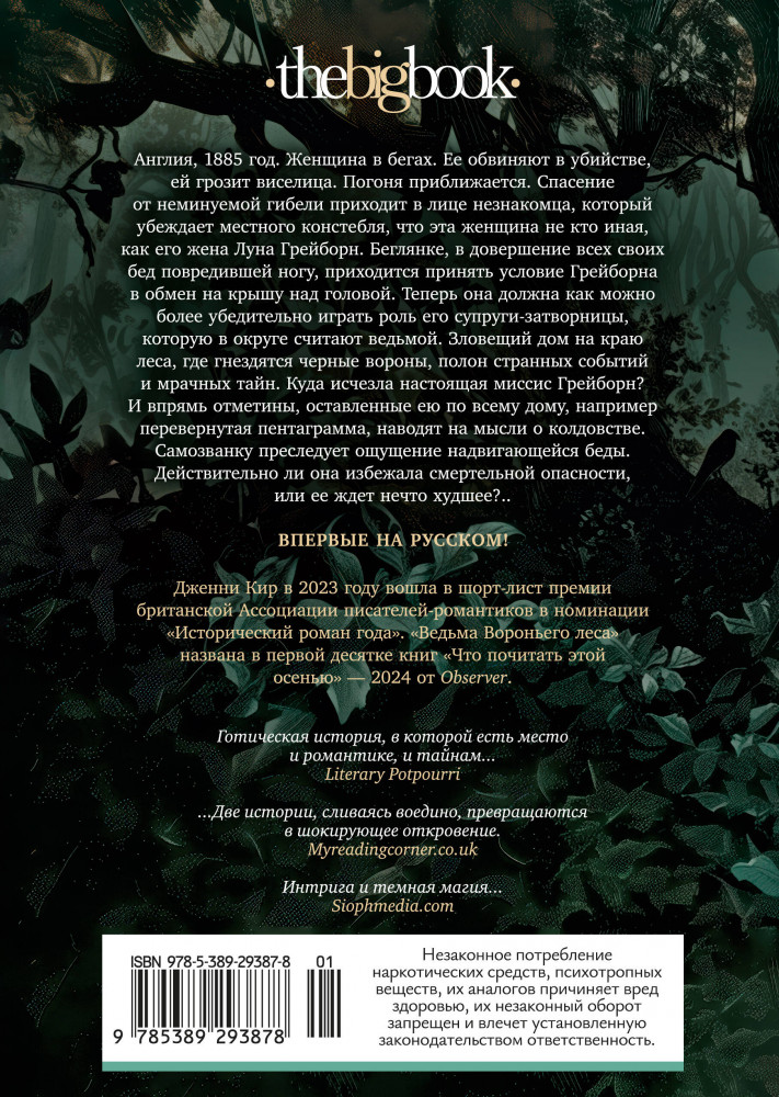 💳 Оплатить за товар можно при получении 🇰🇿 Есть бесплатная доставка по Казахстану от 1 дня 🎁 Копите бонусы с каждой покупки Серия: The Big Book Англия, 1885 год. Женщина в бегах. Ее обвиняют в убийстве, ей грозит виселица. Погоня приближается. Спасение от неминуемой гибели приходит в лице незнакомца, который убеждает местного констебля, что эта женщина — не кто иная, как его жена Луна Грейборн. Беглянке, в довершение всех своих бед повредившей ногу, приходится принять условие Грейборна в обмен на крышу над головой. Теперь она должна как можно более убедительно играть роль его супруги-затворницы, которую в округе считают ведьмой. Зловещий дом на краю леса, где гнездятся черные во́роны, полон странных событий и мрачных тайн. Куда исчезла настоящая миссис Грейборн? И впрямь отметины, оставленные ею по всему дому, — например, перевернутая пентаграмма, — наводят на мысли о колдовстве. Самозванку преследует ощущение надвигающейся беды. Действительно ли она избежала смертельной опасности или ее ждет нечто худшее?.. |