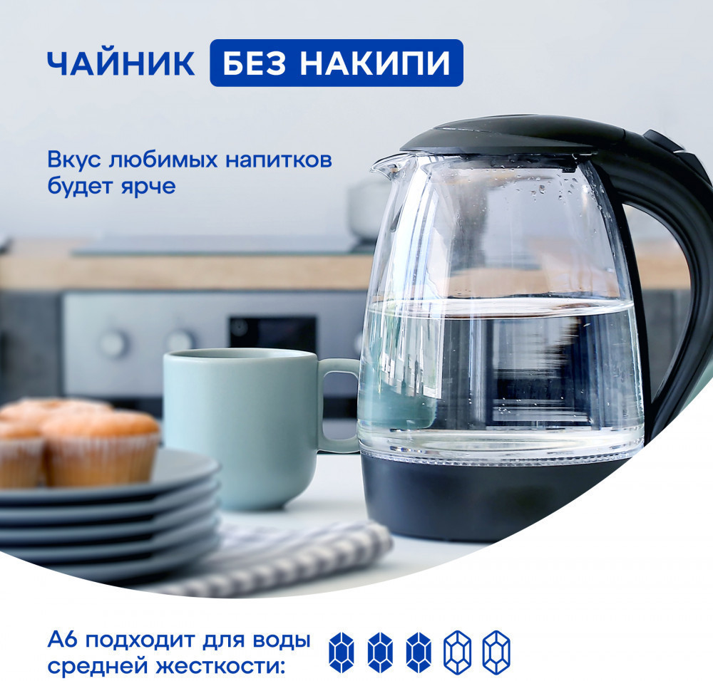 💳 Оплатить за товар можно при получении 🇰🇿 Есть бесплатная доставка по Казахстану от 1 дня 🎁 Копите бонусы с каждой покупки Модуль А6 очищает водопроводную воду от вредных примесей и уменьшает образование накипи в чайнике, мультиварке и кофе-машине. В жесткой воде чай и кофе долго завариваются и получаются не ароматными, а бульоны и другие блюда — пресными, потому что из-за избытка минералов вода плохо «вбирает» вкус ингредиентов. |