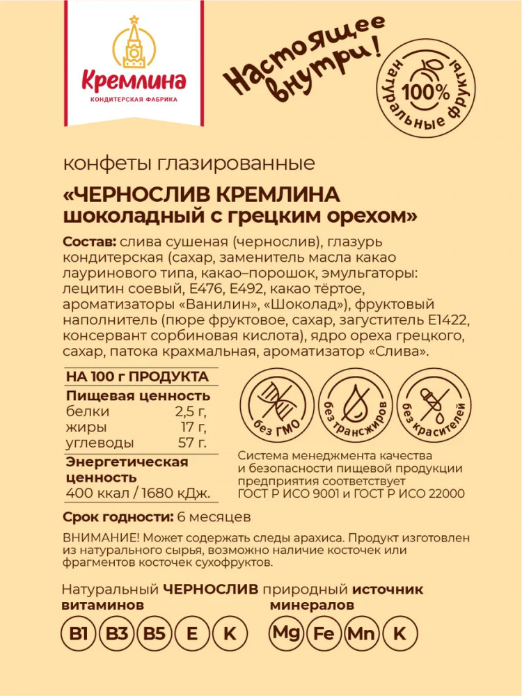 Слива сушеная (чернослив), глазурь кондитерская (сахар, заменитель масла какао лауринового типа, какао – порошок, эмульгаторы: лецитин соевый, Е476, Е492, какао тёртое, ароматизаторы «Ванилин», «Шоколад»), фруктовый наполнитель (пюре фруктовое, сахар, загуститель Е 1422, консервант-сорбиновая кислота), ядро ореха грецкого, сахар, патока крахмальная, ароматизатор «Слива».