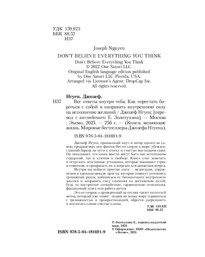 💳 Оплатить за товар можно при получении 🇰🇿 Есть бесплатная доставка по Казахстану от 1 дня 🎁 Копите бонусы с каждой покупки Серия: Книги, меняющие жизнь. Мировые бестселлеры Джозефа Нгуена Почему мы часто застреваем на пути к мечтам, хотя кажется, что всё в наших руках? Главный барьер — не обстоятельства и не отсутствие силы воли, а бесконечный поток собственных мыслей. Мы верим им, позволяем им управлять нашим настроением и решениями — и сами становимся препятствием для своего счастья и успеха. Джозеф Нгуен, признанный коуч и автор одной из самых продаваемых нон-фикшен книг в мире, предлагает не просто заглянуть внутрь себя, а научиться по-новому относиться к своим мыслям. Его подход прост: именно мысли могут быть как источником тревоги и сомнений, так и ключом к внутренней свободе. |