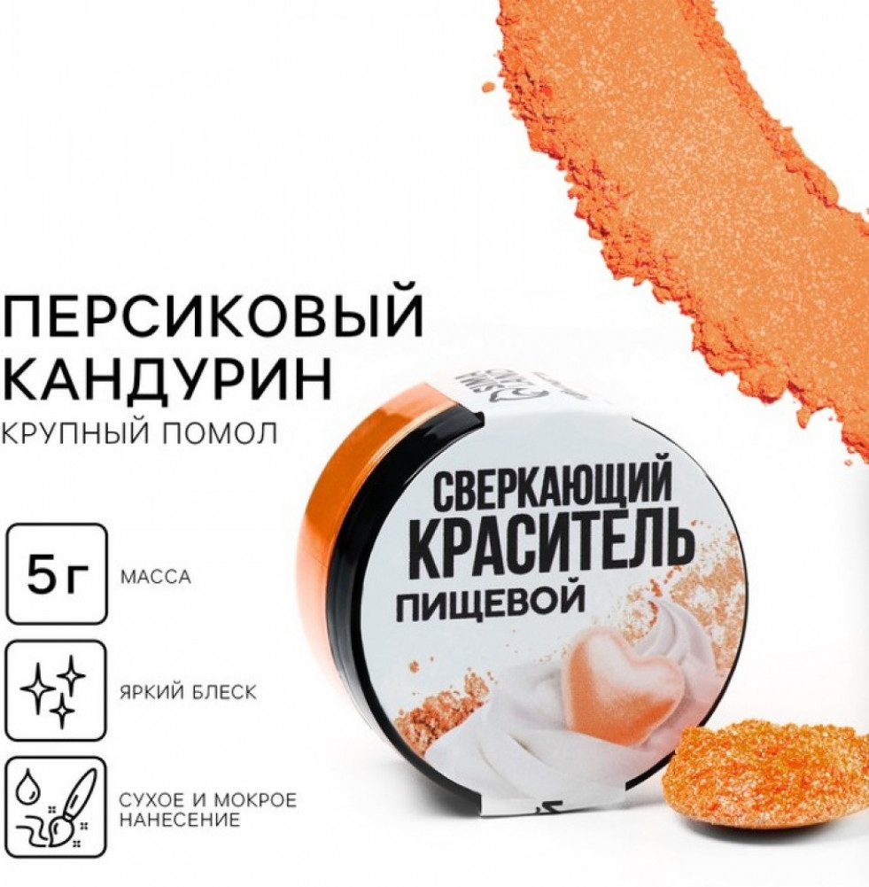 💳 Оплатить за товар можно при получении 🇰🇿 Есть бесплатная доставка по Казахстану от 1 дня 🎁 Копите бонусы с каждой покупки Кандурин крупный «Персиковый» — это водорастворимый пищевой краситель с деликатным перламутровым блеском, который придаёт десертам и напиткам изысканный сияющий оттенок. Нежный персиковый цвет создаёт эффект лёгкого мерцания и делает подачу по-настоящему праздничной. |