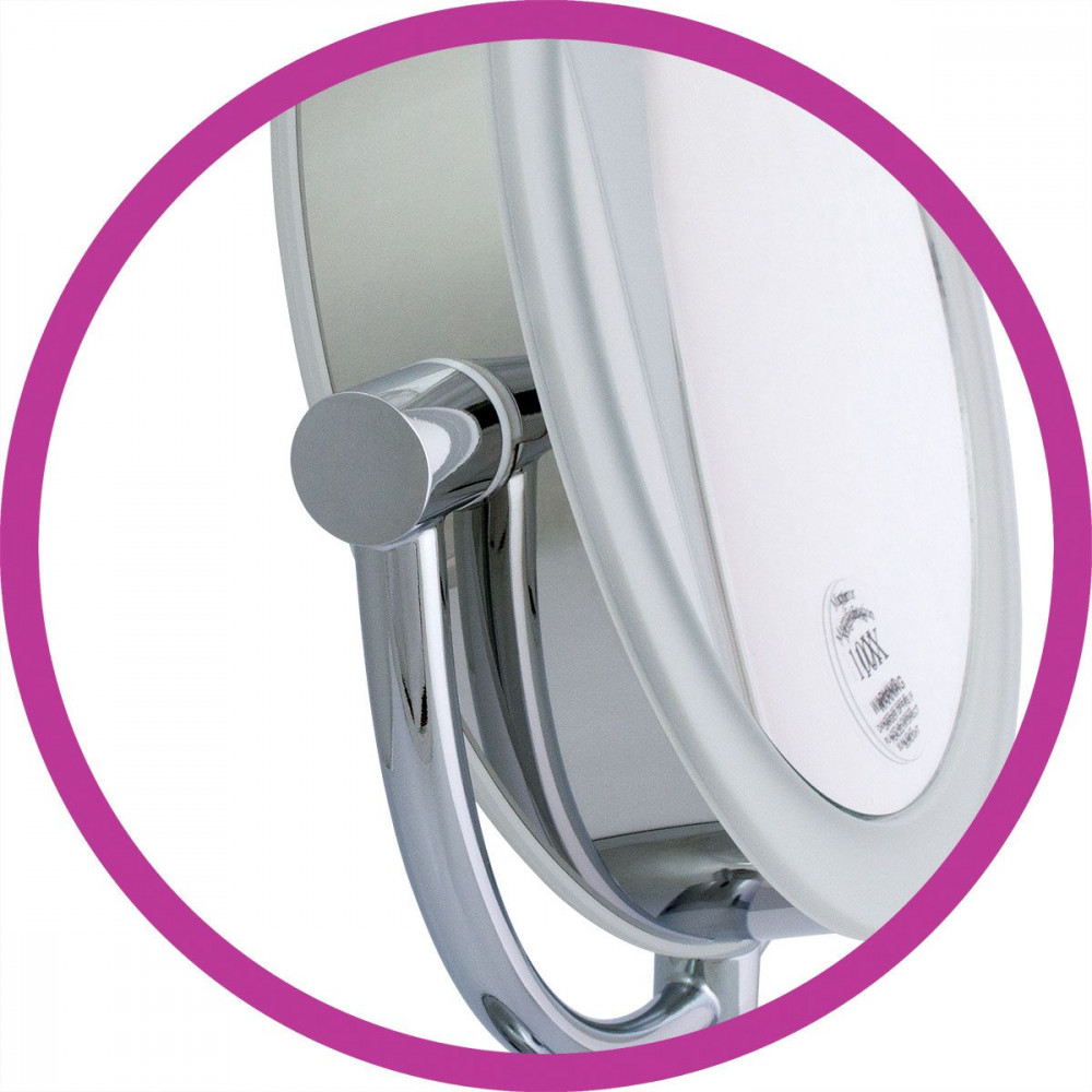 Регулируемая по яркости LED-подсветка, дает возможность пользоваться зеркалом в самом темном месте, в любое время суток, а благодаря матовой поверхности LED-подсветки, свет рассеивается мягко и комфортно для глаз. 10-кратное увеличение позволяет разглядеть самые проблемные участки кожи, а также позволяет наносить макияж аккуратно и с высокой точностью людям, даже со слабым зрением.