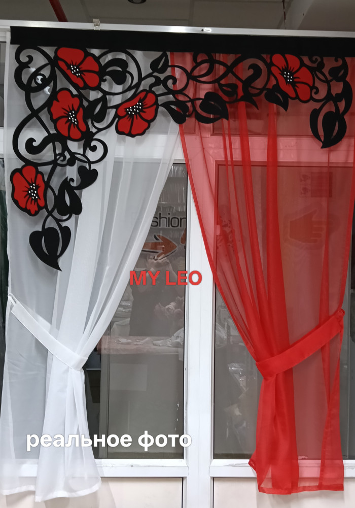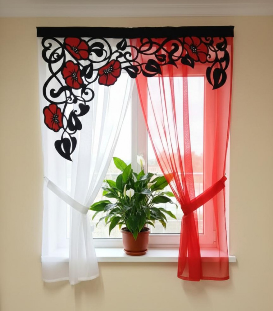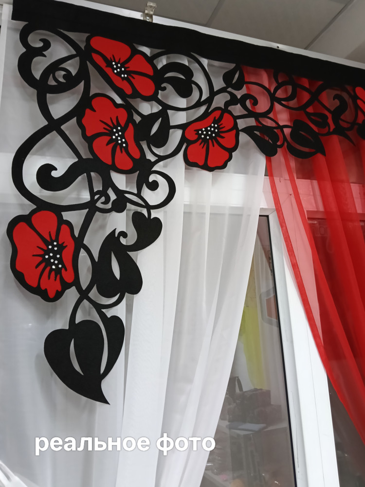 Занавеска с ажурным ламбрекеном из фетра ручной работы Вьюнки. Эффектное сочетание красного и белого полотна с изысканным черным узором и красными цветами притягивает взгляд и делает окно главным украшением комнаты.