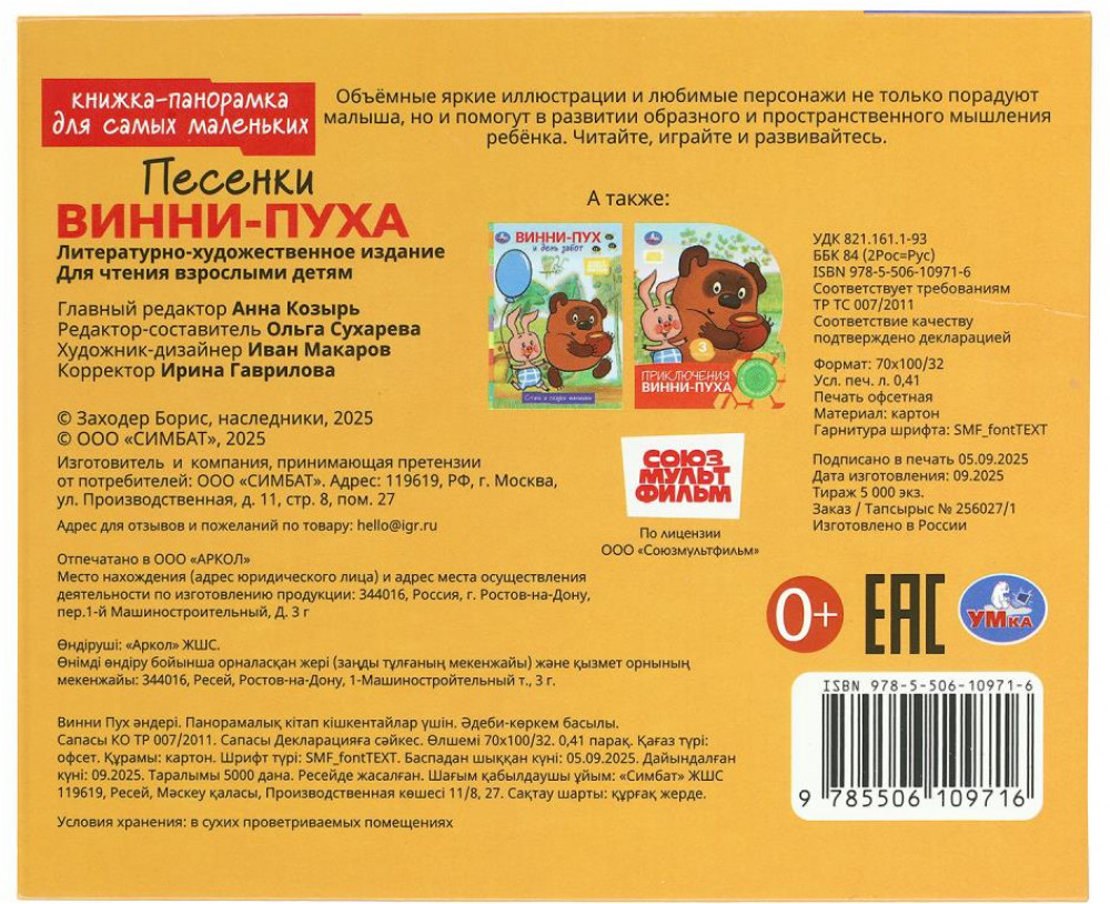 💳 Оплатить за товар можно при получении 🇰🇿 Есть бесплатная доставка по Казахстану от 1 дня 🎁 Копите бонусы с каждой покупки Серия: Союзмультфильм Книжка-панорамка для самых маленьких «Союзмультфильм. Песенки Винни-Пуха» ТМ «УМка» — отличный подарок для маленьких любознаек. Малыш с удовольствием будет листать яркие странички и вспоминать песенки из любимого мультфильма, герои которого будут «оживать» на страницах данного издания благодаря объёмным картинкам. Книжку-панорамку можно использовать не только для чтения, но и для организации игр-представлений, что делает её отличным инструментом для всестороннего развития ребёнка. |