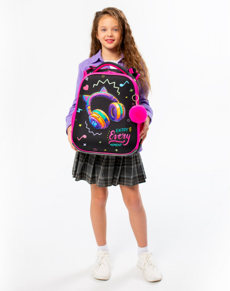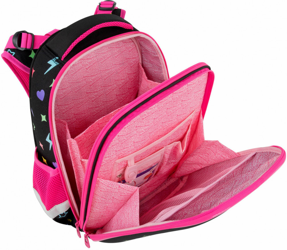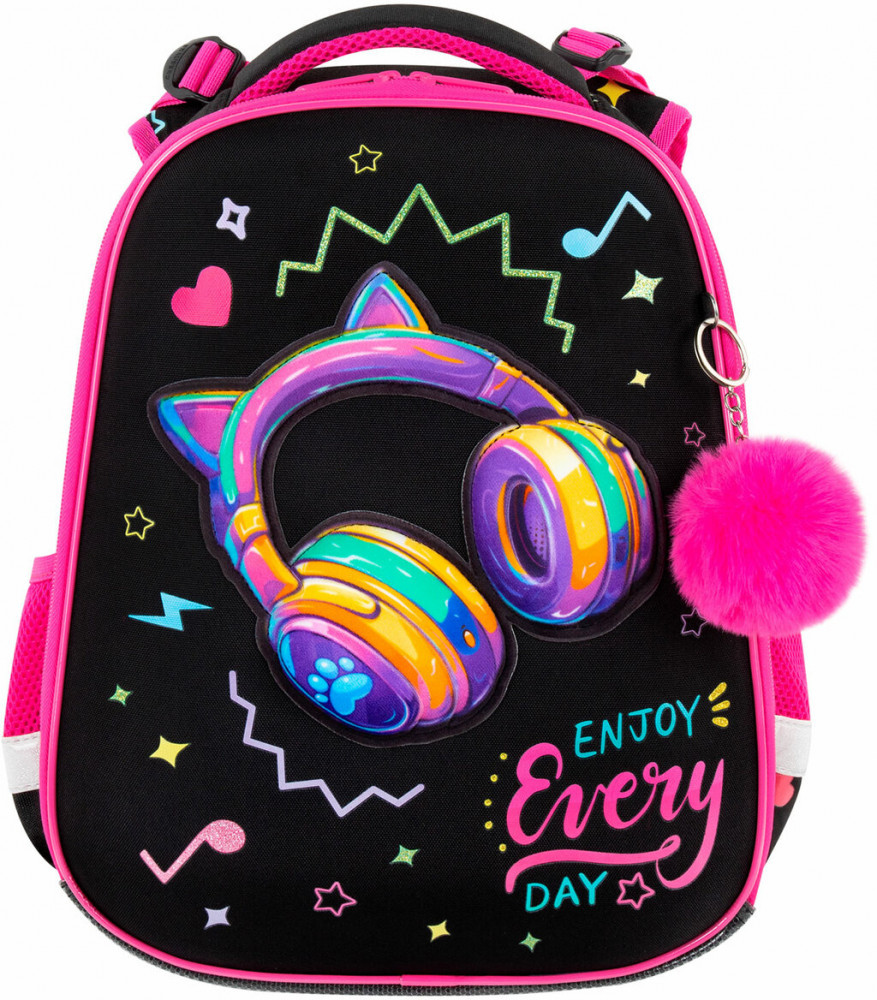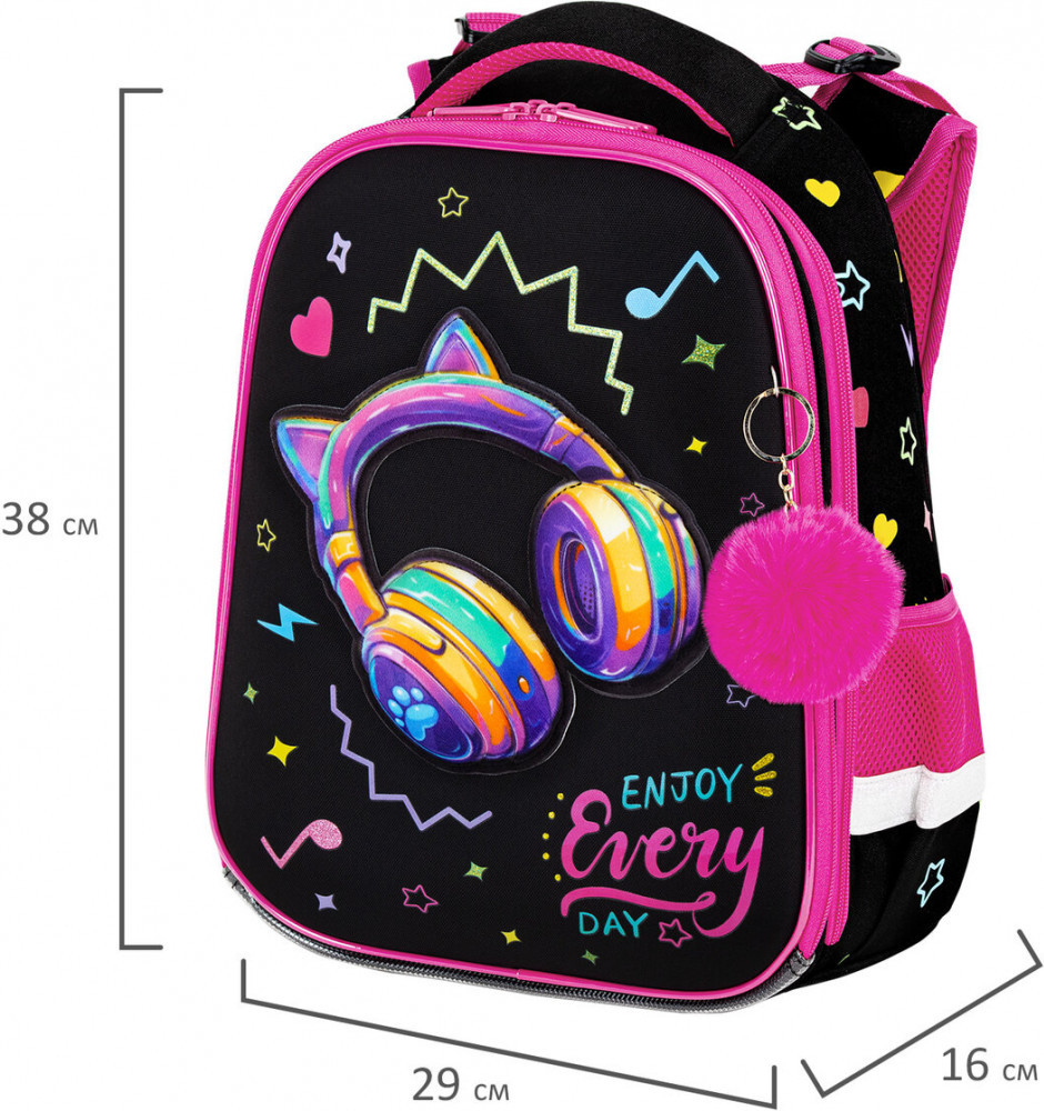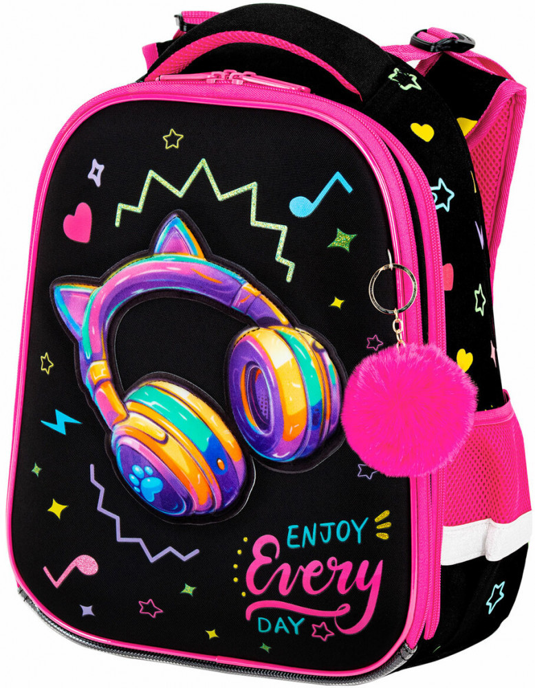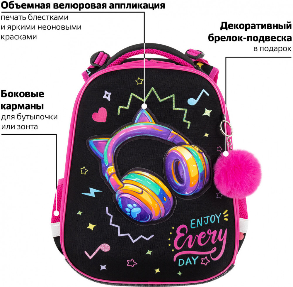 Дизайн передней панели дополнен объемной велюровой аппликацией, печатью блестками и яркими неоновыми красками! Пушистый брелок-подвеска дополняет дизайн ранца.