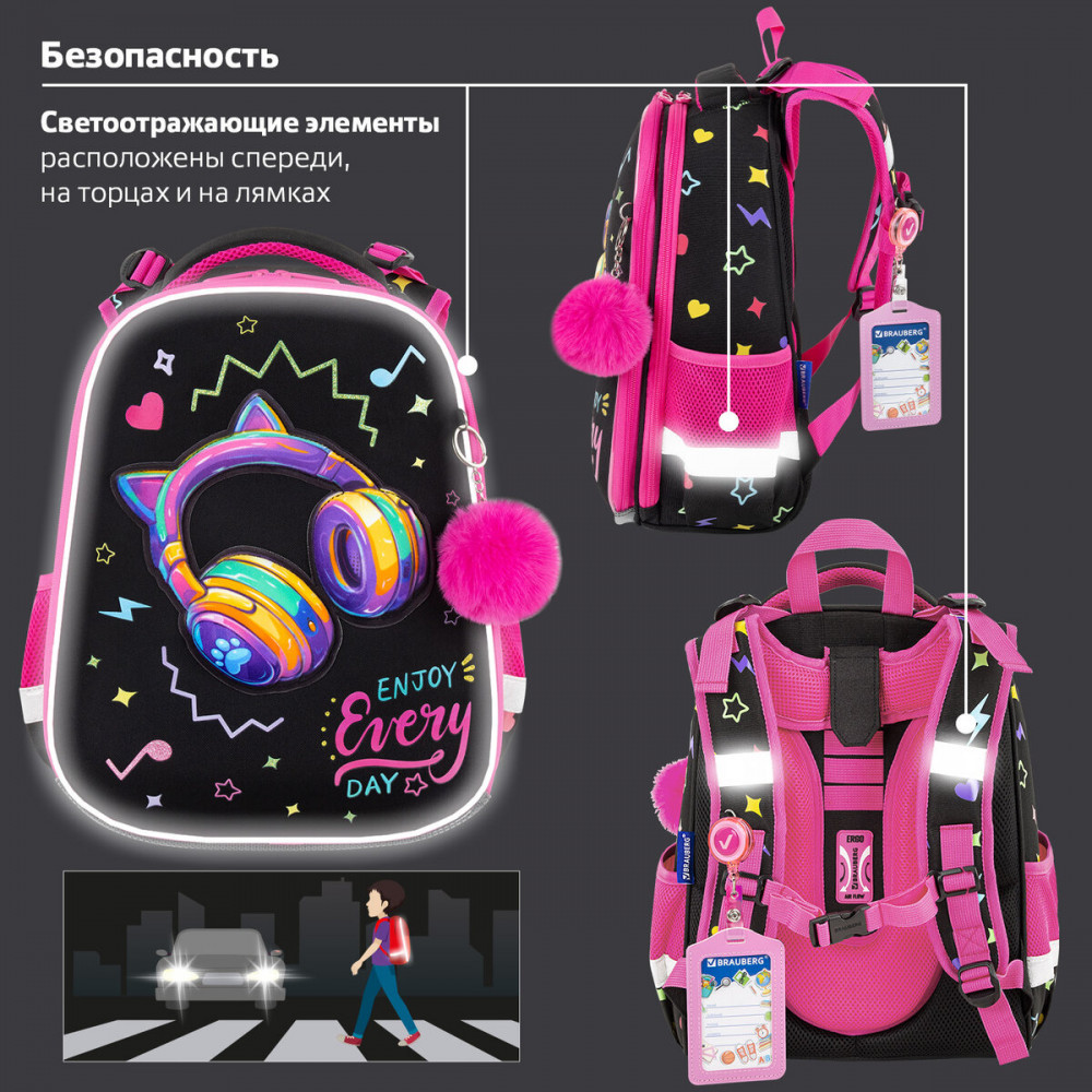 Светоотражающие элементы ранца расположены спереди, на торцах и на лямках. Они необходимы для безопасности пользователя в темное время суток.