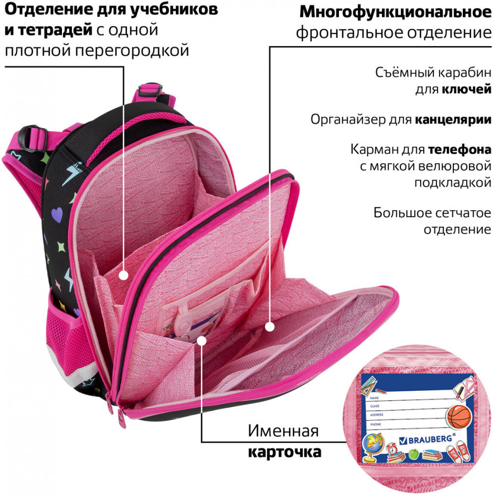 В основном отделении ранца можно легко и быстро разместить учебники и тетради. Внутри фронтального отделения находится органайзер для канцелярских принадлежностей, именная карточка, карман для телефона, съёмный карабин для ключей и большое отделение из сетки. Такая организация пространства поможет сохранить принадлежности в порядке и приучить ребенка к аккуратности. Ранец широко раскрывается, что повышает удобство использования, а за счёт боковых перегородок содержимое не выскользнет из ранца.