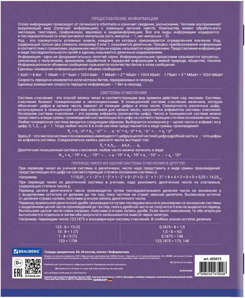 Тетрадь по информатике формата А5 (165х205 мм) содержит 36 листов, изготовленных из высококачественной офсетной бумаги плотностью 60 г/м2, 100% белизны. Листы соединены скобами. Блок разлинован в клетку с красными полями. Обложка выполнена из мелованной бумаги плотностью 170 г/м2. На обратной стороне обложки размещена основная справочная информация по школьному предмету.
