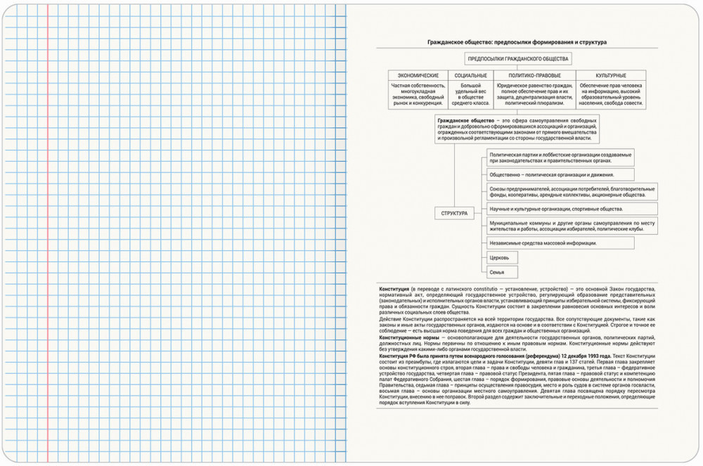 Тетрадь по обществознанию формата А5 (165х205 мм) содержит 48 листов, изготовленных из высококачественной офсетной бумаги плотностью 60 г/м2 и белизной 100%. Листы соединены скобами. Линовка блока – в клетку, красные поля. Обложка выполнена из мелованного картона плотностью 190 г/м2 в тематике соответствующего предмета. Спецэффект "TWIN-лак" придает изображениям оригинальность и выразительность. В справочном материале для учащихся собраны основные подсказки по школьному предмету.