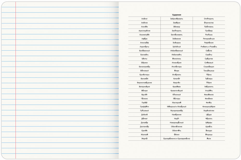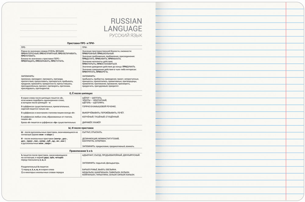 Тетрадь по русскому языку формата А5 (165х205 мм) содержит 48 листов, изготовленных из высококачественной офсетной бумаги плотностью 60 г/м2 и белизной 100%. Листы соединены скобами. Линовка блока – в линию, красные поля. Обложка выполнена из мелованного картона плотностью 190 г/м2 в тематике соответствующего предмета. Спецэффект "TWIN-лак" придает изображениям оригинальность и выразительность. В справочном материале для учащихся собраны основные подсказки по школьному предмету.