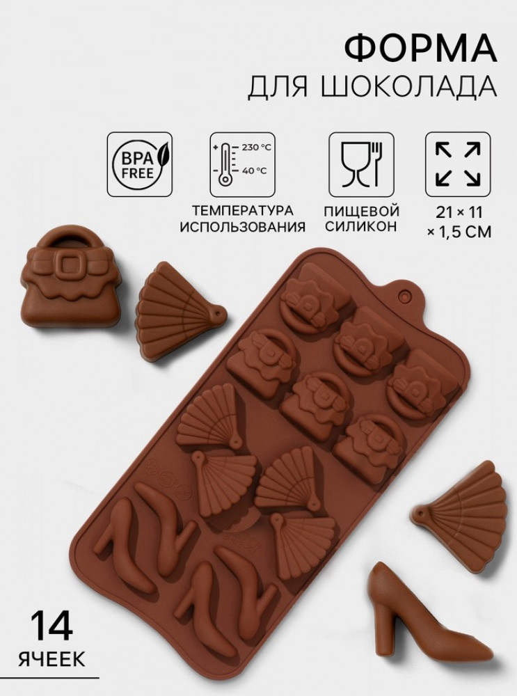 Доляна Форма для кондитерских украшений «Дамский набор»В данный момент этот товар отсутствует в продаже. Возможно, у нас найдется аналогичный или похожий товар здесь. Силиконовая форма «Дамский набор» — изящное решение для создания сладких или декоративных композиций к 8 Марта и другим женским праздникам. В ней 14 ячеек с силуэтами, отсылающими к классическим атрибутам утончённого образа: зеркальца, помады, сумочки, ботинки на каблуке. Коричневый силикон подчёркивает детали без отвлекающих рисунков, оставляя акцент на форме. |