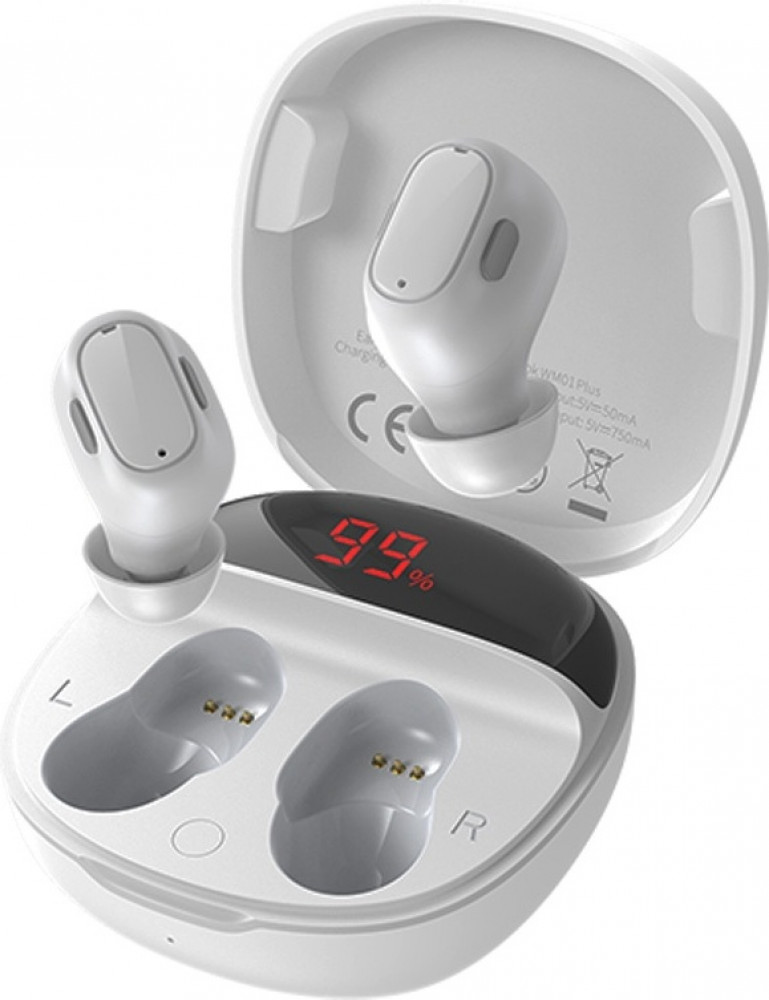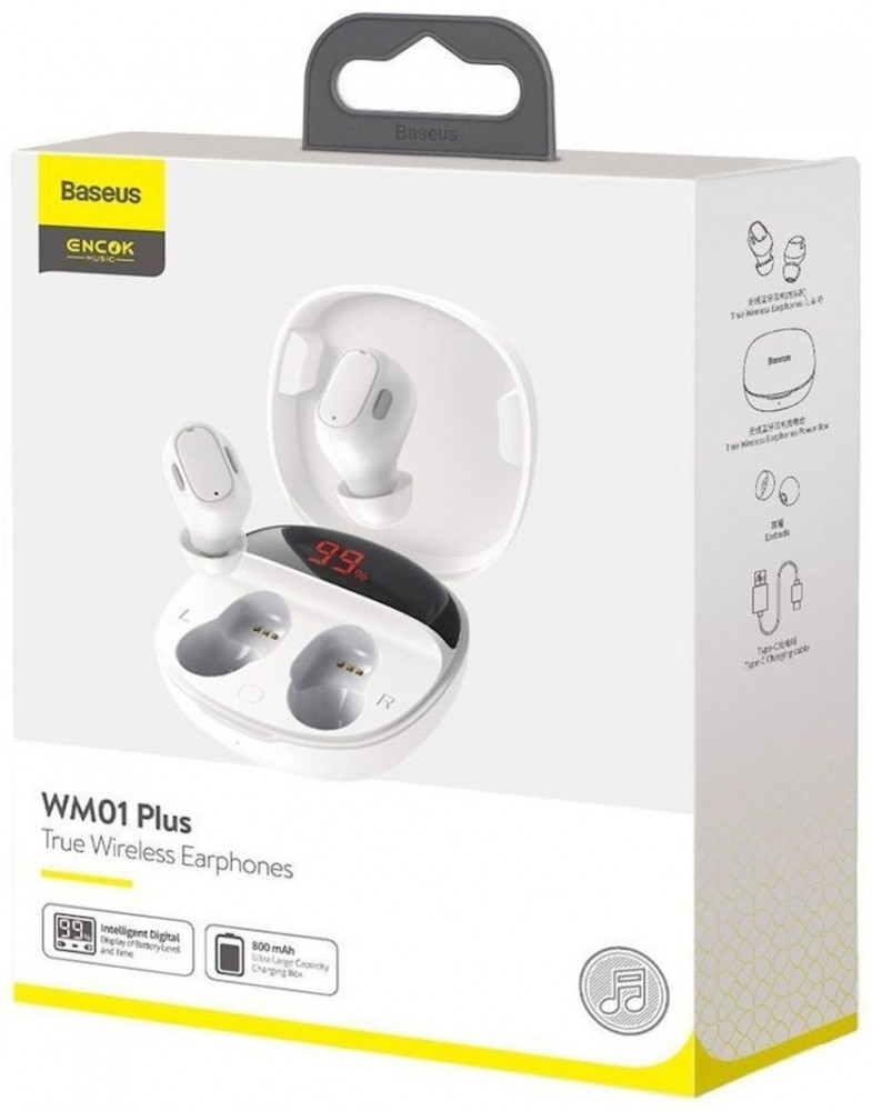 Baseus Encok WM01 Plus — миниатюрные и легкие TWS-наушники с качественным звуком и сенсорным управлением. Удобная посадка, надежная связь, встроенный микрофон и длительное время автономной работы — главные преимущества этой модели. Каждый вкладыш может работать отдельно от другого, в том числе как Bluetooth-гарнитура. При совместном использовании голос собеседника слышен в обоих наушниках. Работают они от аккумулятора, обеспечивающего до 5 часов непрерывного музыкального концерта. Продлить время работы до 50 часов можно с помощью зарядного чехла. Уровень заряда каждого вкладыша и бокса отображается на небольшом дисплее, расположенном под крышкой кейса.