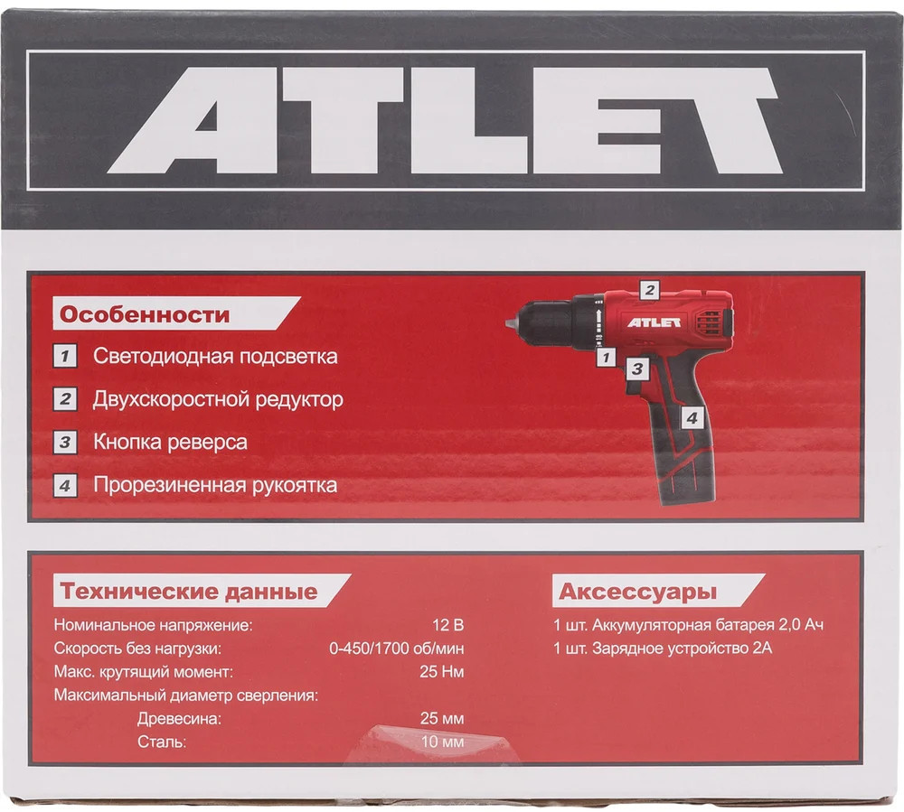 Аккумуляторная дрель-шуруповерт ATLET CDT212D — это инструмент DIY-сегмента, используемый в повседневной жизни. Оснащенная одним литий-ионным аккумулятором и зарядным устройством, дрель может использоваться для мелкого ремонта и бытовых нужд при сверлении и работах с крепежом. Благодаря двухскоростному редуктору, вы можете решать задачи различного характера. Встроенная светодиодная подсветка позволяет работать в условиях плохой видимости, а функция реверса переключает направление вращения для завинчивания и отвинчивания. Легкий вес и прорезиненная рукоятка делают инструмент более удобным для использования при длительной работе.