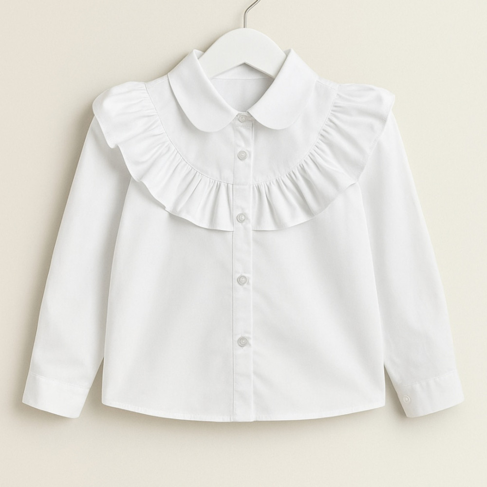 Детская белая рубашка с длинными рукавами выполнена из гладкой хлопковой ткани. Украшена округлым воротничком и изящной оборкой по линии груди и плеч, придающей образу романтичный и нарядный вид. Застёжка на пуговицы по центру. Идеально подходит для праздников, школы или торжественных мероприятий.