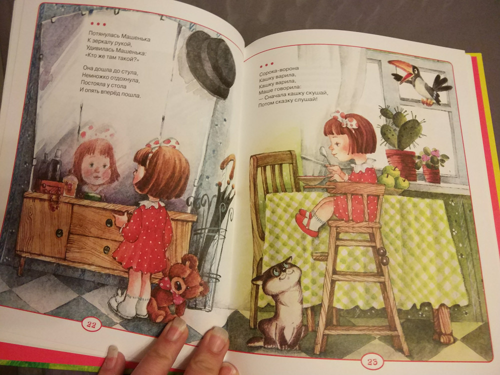 Отличная книга! Стихи знакомые с детства, милые, красочные иллюстрации, хорошее качество печати, плотная бумага. Ребенка (1.3 года) от книги не оторвать!