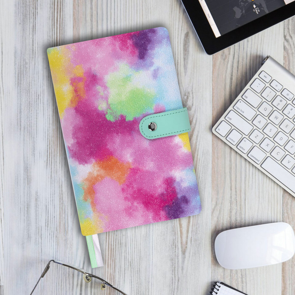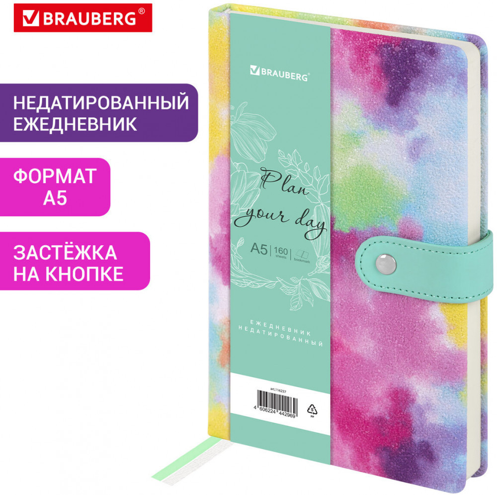 Недатированный ежедневник BRAUBERG в твёрдой обложке с эффектом каменной крошки и застёжкой — яркое, стильное и компактное решение для эффективного планирования и создания имиджа пунктуального человека.