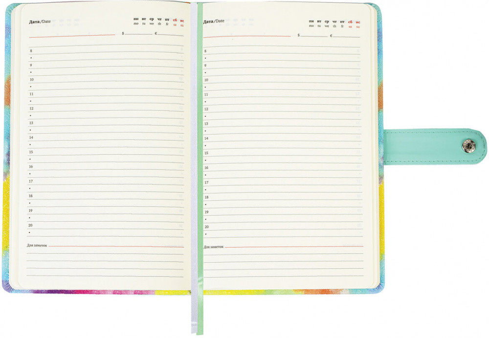 Твердая обложка с эффектом каменной крошки подходит для горячего тиснения. Также обложка фиксируется застежкой, поэтому ежедневник не откроется в сумке или портфеле и страницы не помнутся. Яркие цвета придают изделию особый шарм. Дополнением служат 2 закладки-ляссе, с помощью которых можно быстро открыть ежедневник на нужной странице. Кроме того, ежедневник снабжен обширным справочным материалом. В конце имеются 7 страниц для записей и заметок.