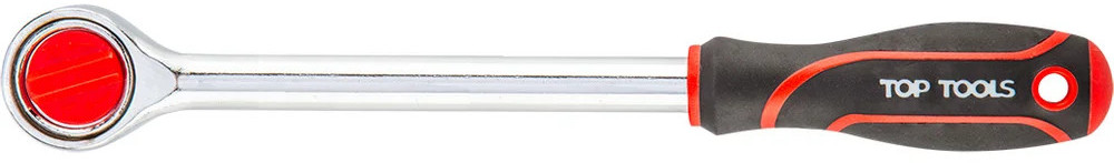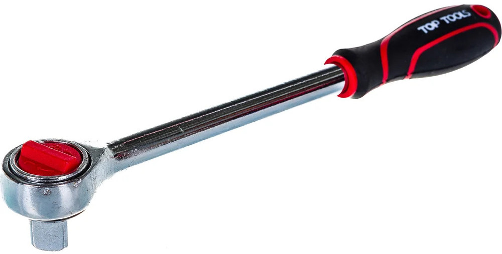 Ключ-трещотка 1/2″ 225 мм, 24 зуба Top tools предназначен для быстрого монтажа резьбовых соединений. Имеется нескользящая прорезиненная рукоятка. Присоединительный квадрат с шариковым фиксатором надежно удерживает съемные торцевые головки различных размеров, удлинители, адаптеры. Храповый механизм с переключателем обеспечивает плавный ход и возможность быстрой смены направления вращения ключа.