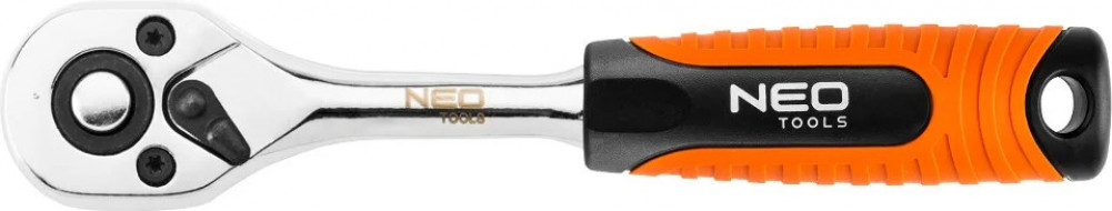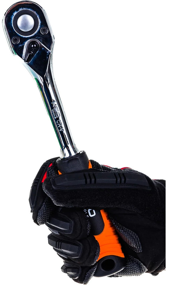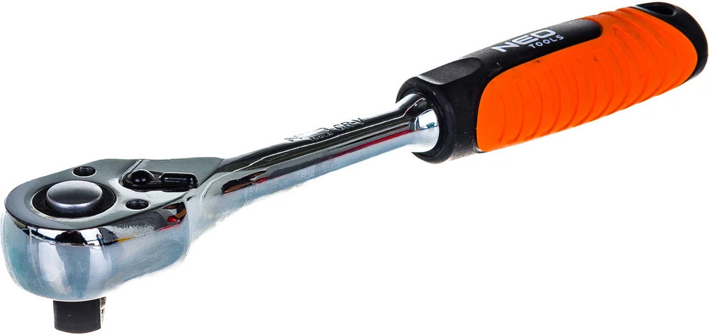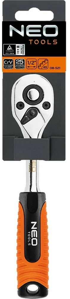 Трещоточный ключ 1/2″, 265 мм 45 зубца двухкомпонентная ручка NEO Tools 08-521 имеет храповый механизм с 45 зубцами, что повышает удобство работы в ограниченном пространстве. Трещотка выполнена из хромомолибденовой стали, а корпус — из хромованадиевой, благодаря чему обеспечен длительный срок эксплуатации. Двухкомпонентная накладка на рукояти гарантирует надежный хват и полный контроль над инструментом.