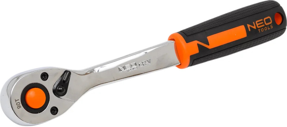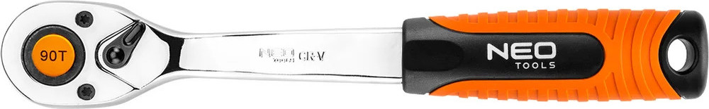 NEO Tools Ключ трещоточный 1/2 90 зубов 08-536 изготовлен в соответствии со стандартом DIN 3122. Храповой механизм с 90 зубцами изготовлен из чрезвычайно прочной хромованадиевой стали, увеличивающей срок службы инструмента. Эргономичная двухкомпонентная рукоятка повышает комфорт работы.