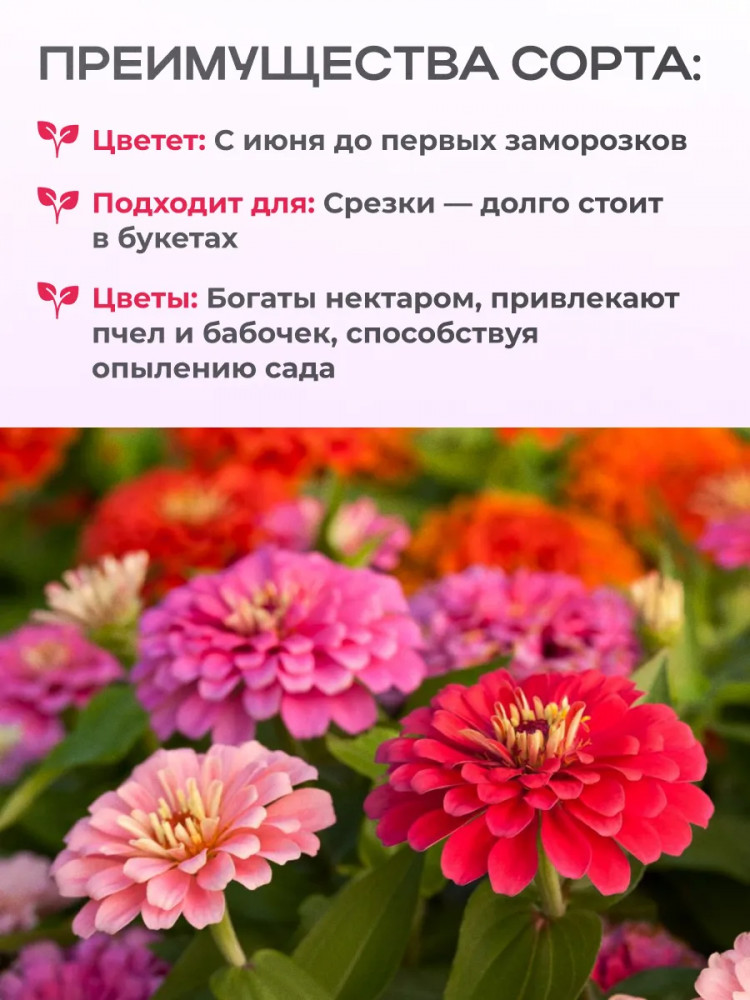 💳 Оплатить за товар можно при получении 🇰🇿 Есть бесплатная доставка по Казахстану от 1 дня 🎁 Копите бонусы с каждой покупки Низкорослая, яркая смесь махровых и полумахровых сортов цинний. Кустики компактные, густоветвистые, высотой 40 см. Соцветия 5-6 см. Цветение обильное. Каждый цветок держится на растении более месяца. Используется для групповых и одиночных по садок на клумбах, в рабатках и бордюрах. Подходит для выращивания в горшках и балконных ящиках. |