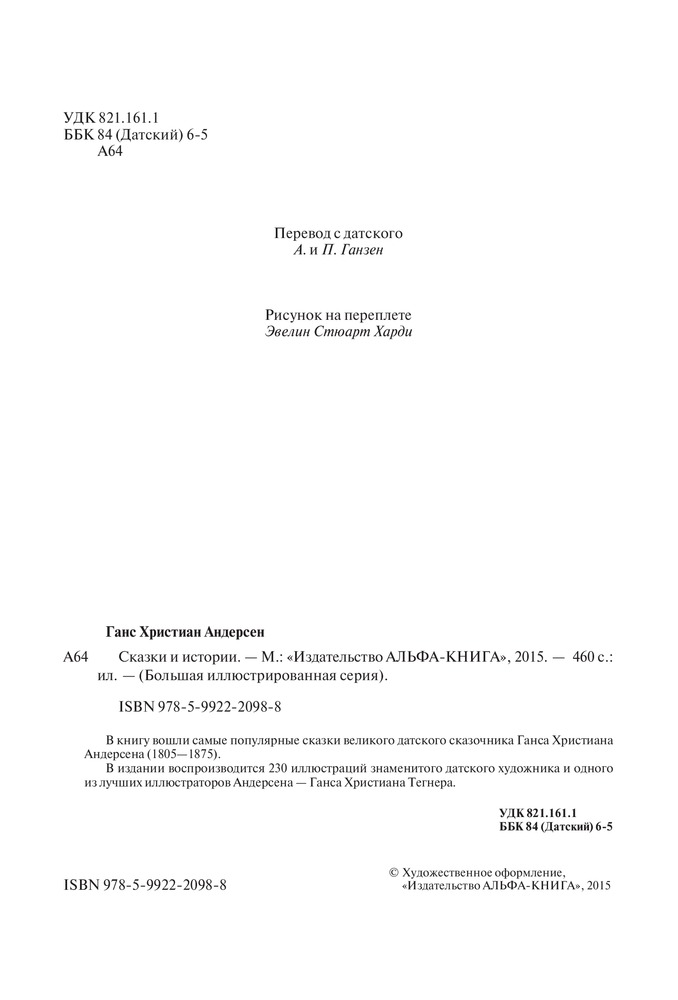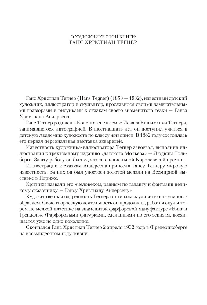 В издании воспроизводится 230 иллюстраций знаменитого датского художника и одного из лучших иллюстраторов Андерсена — Ганса Христиана Тегнера. |
