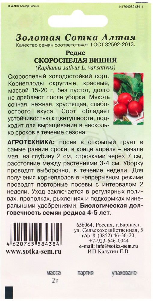 Золотая сотка Алтая Семена редиса «Скороспелая вишня»+4