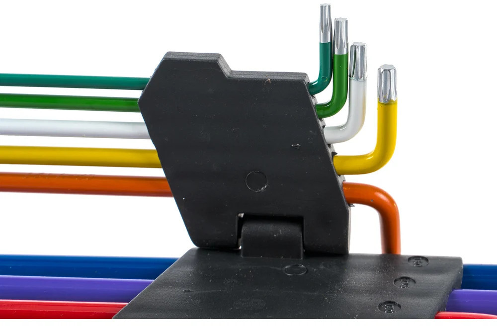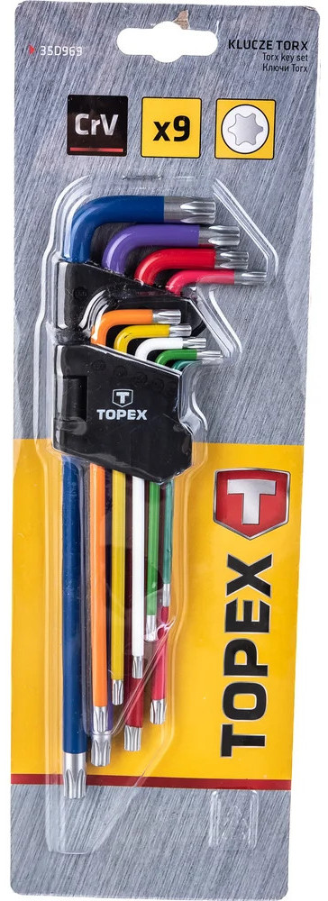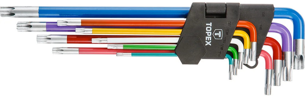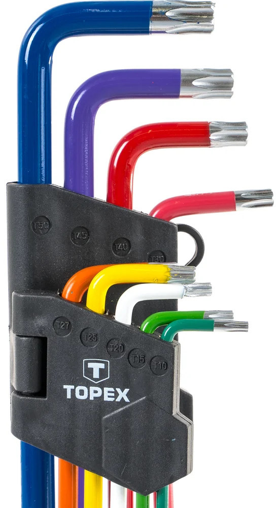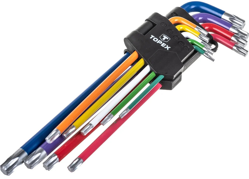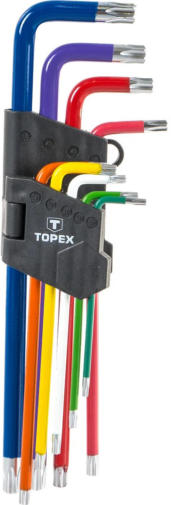 Шестигранные ключи Torx, T10-T50 мм, набор 9 шт. TOPEX 35D969 имеют угловую форму. Инструмент поставляется в пластиковом держателе. Для облегчения подбора ключа под размер крепежа имеется цветовое оформление изделий. Ключи выполнены из прочной хромомолибденовой стали.