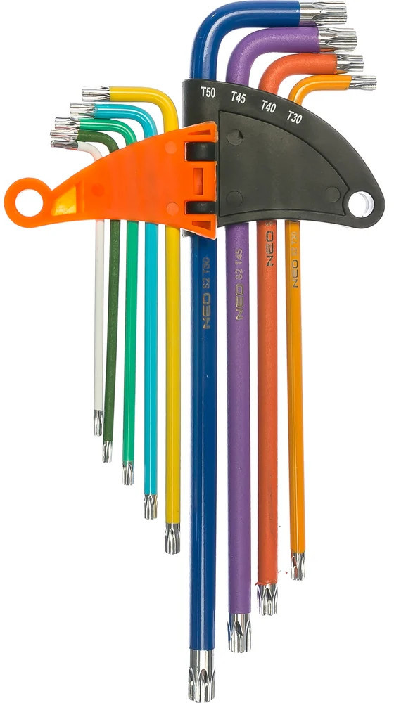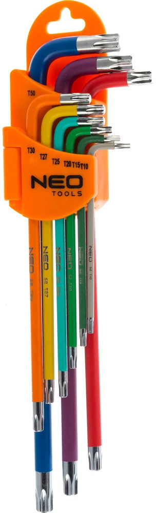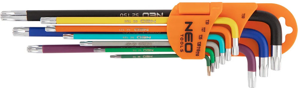 Шестигранные ключи NEO T10-T50 мм, 9 шт. 09-518 предназначены для монтажа и демонтажа крепежа. Изготовлены из высокосортной стали SNCM+V, что обеспечивает долгий срок службы. Цветная маркировка ключей позволяет легко выбрать нужный размер для работы. Набор поставляется в удобной упаковке.