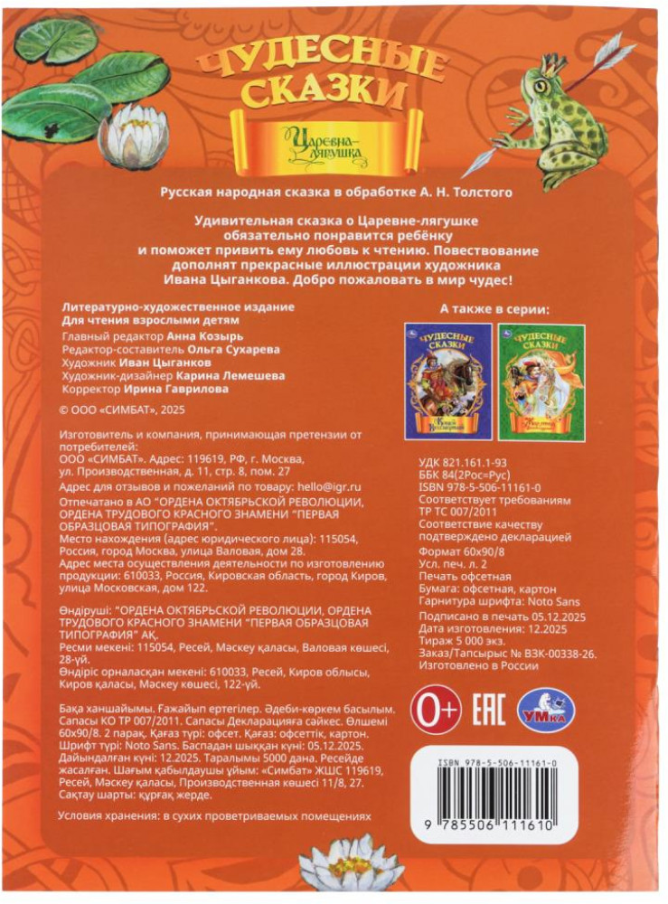 💳 Оплатить за товар можно при получении 🇰🇿 Есть бесплатная доставка по Казахстану от 1 дня 🎁 Копите бонусы с каждой покупки Серия: Чудесные сказки Книга-брошюра «Царевна-лягушка» из серии «Чудесные сказки» ТМ «УМка» - отличный подарок для ребёнка. Эта увлекательная история не оставит равнодушным ни одного малыша — захватывающий сюжет увлечёт ребёнка с первых же строк. Яркие, запоминающиеся иллюстрации художника Ивана Цыганкова превратят чтение в настоящее приключение: каждый разворот книги — как окно в сказочный мир, где оживают герои и происходят чудеса. Формат А4 идеально подходит для совместного чтения — текст хорошо читается, а картинки достаточно крупные, чтобы ребёнок мог разглядеть все детали. |